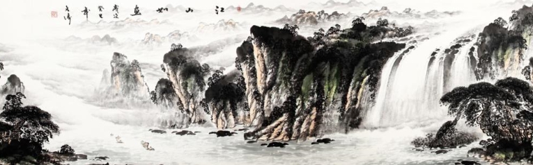作品描绘浔阳一带景色,一连铺排了长江、淮山、帆、泉、云、月、大雁七种景物,每一种都加意出色,有着鲜明、充实的形象。画面有面有点有线有片,有青有白,有静物有动态,远近高下,相得益彰,诚可谓尺幅千里。