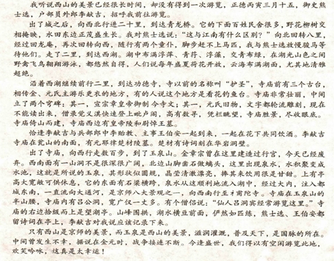 A.文章以西湖和玉泉山为描绘的重点,记叙了携友踏青的过程,游览的功德寺在玉泉山的半山腰。