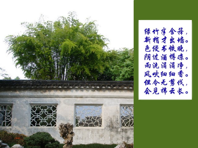 翻译: 嫩绿的新竹有一半还包着笋壳,新长出的竹梢才高出墙头。嫩绿的颜色映侵着书套,久久不退;当竹影移过,酒也顿是变的清凉。新雨过后,竹子更加美好洁净;微风吹来,可以闻到淡淡的清香。只要不被摧残,新竹一定可以长到高矗云霄。