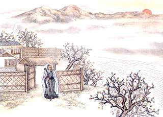 “渡头余落日,墟里上孤烟。”颈联写原野暮色。夕阳欲落,炊烟初升,是田野黄昏的典型景象。渡头在水,墟里在陆;落日属自然,炊烟属人事:景物的选取是很见匠心的。“墟里上孤烟”,显系从陶潜“暧暧远人村,依依墟里烟”(《归田园居之一》)点化而来。但陶句是拟人化的表现远处村落上方炊烟萦绕、不忍离去的情味,王句却是用白描手法表现黄昏第一缕炊烟袅袅升到半空的景象,各有各的形象,各有各的意境。这一联是王维修辞的名句,历来被人称道。“渡头余落日”,精确地剪取落日行将与水面相切的一瞬间,富有包孕地显示了落日的动态和趋向,在时间和空间上都为读者留下想象的余地。“墟里上孤烟”,写的也是富有包孕的片刻。“上”字,不仅写出炊烟悠然上升的动态,而且显示已经升到相当的高度。