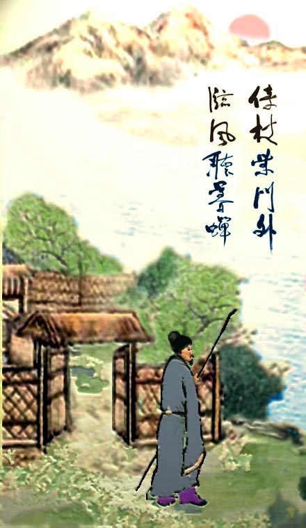 首、颈两联,以寒山、秋水、落日、孤烟等富有季节和时间特征的景物,构成一幅和谐静谧的山水田园风景画。但这风景并非单纯的孤立的客观存在,而是画在人眼里,人在画图中,一景一物都经过诗人主观的过滤而带上了感情色彩。颔联:“倚杖柴门外,临风听暮蝉。”这就是诗人的形象。柴门,表现隐居生活和田园风味;倚杖,表现年事已高和意态安闲。柴门之外,倚杖临风,听晚树鸣蝉、寒山泉水,看渡头落日、墟里孤烟,那安逸的神态,潇洒的闲情,和“策扶老以流憩,时矫首而遐观”(《归去来辞》)的陶渊明有几分相似。事实上,王维对那位“古今隐逸诗人之宗”,也是十分仰慕的,就在这首诗中,不仅仿效了陶的诗句,而且在尾联引用了陶的典故:“复值接舆醉,狂歌五柳前。”陶文《五柳先生传》的主人公,是一位忘怀得失、诗酒自娱的隐者,“宅边有五柳树,因以为号焉。”实则,生正是陶潜的自我写照;而王维自称五柳,就是以陶潜自况的。接舆,是春秋时代“凤歌笑孔丘”的楚国狂士,诗人把沉醉狂歌的裴迪与楚狂接舆相比,乃是对这位年轻朋友的赞许。陶潜与接舆──王维与裴迪,个性虽大不一样,但那超然物外的心迹却是相近相亲的。所以,“复值接舆醉”的复字,不表示又一次遇见裴迪,而是表示诗人情感的加倍和进层:既赏佳景,更遇良朋,辋川闲居之乐,至于此极啊!末联生动地刻画了裴迪的狂士形象,表明了诗人对他的由衷的好感和欢迎,诗题中的赠字,也便有了着落。