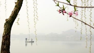 半烟半雨江桥畔,映杏映桃山路中。