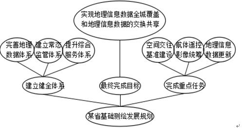 下面是“某省基础测绘发展规划”的构思框架图,请把这个构思写成一段话,要求内容完整,表述准确,语言连贯,不超过100个字。(6分)