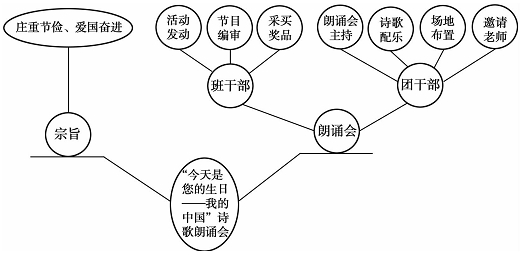 【答案】高三(1)班“今天是您的生日——我的中国”诗歌朗诵会以“庄重节俭、爱国奋进”为宗旨,班干部负责活动发动、节目编审及采买物品,团干部负责朗诵会主持、诗歌配乐及场地布置、邀请老师。