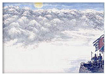 五、六两句写景描绘了边疆大漠中壮阔雄奇的景象,境界阔大,气象雄浑。这一联由两个画面组成。第一个画面是大漠孤烟。置身大漠,展现在诗人眼前的是这样一副景象:黄沙莽莽,无边无际。昂首看天,天空没有一丝云影。不见草木,断绝行旅。极目远眺,但见天尽头有一缕孤烟(狼烟)在升腾,诗人的精神为之一振,似乎觉得这荒漠有了一点生气。那是烽烟,它告诉诗人,此行快要到目的地了。烽烟是边塞的典型景物,“孤烟直”,突出了边塞气氛。从画面构图的角度说。在碧天黄沙之间,添上一柱白烟,成为整个画面的中心,自是点睛之笔。《坤雅》:“古之烟火,用狼烟,取其直而聚,虽风吹之不斜。”清人赵殿成说:“亲见其景者,始知‘直’字之佳。”这又是从用字上说。