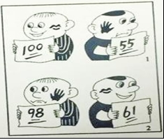 ①这一则漫画是一组巧妙的、富有深意的对比。先拿满分后拿98分的孩子先后收获了香吻和一个耳光,而先拿55分后拿61分的孩子则先后得了一个耳光和一个香吻。从这两个孩子的境遇上,我们看到了许多人有意无意抱有的一种心态:追求卓越、积极进取,否认失误和退步,哪怕这个“失误”仅仅两分。