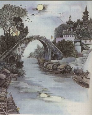 一:月亮落下去了,乌鸦不时地啼叫,茫茫夜色中似乎弥漫着满天的霜华,面对岩上隐约的枫树和江中闪烁的渔火,愁绪使我难以入眠。夜半时分,苏州城外的寒山寺凄冷的钟声,悠悠然飘荡到了客船。