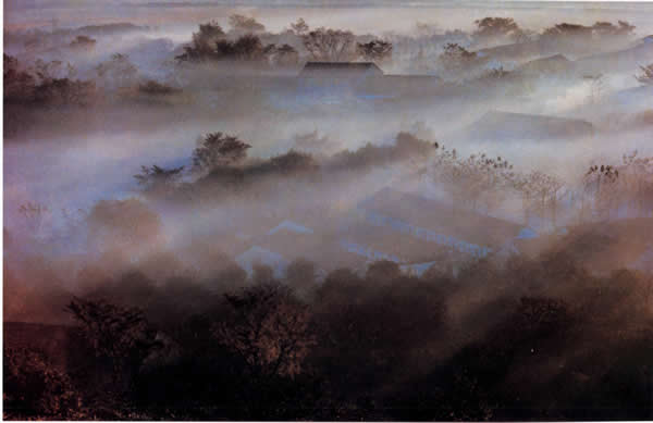 远远的住人村落依稀可见,树落上的炊烟随风轻柔地飘升。