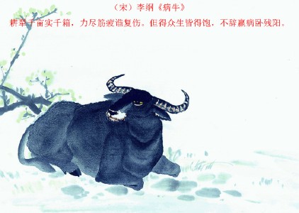 这首诗惟妙惟肖地刻画了一个病牛的形象,既绘出其身体病弱之形,更传出了其不辞羸病、志在众生之神。如此咏牛,颇为切合牛任劳任怨、唯有奉献、别无他求的性格特点。不过,此诗并非为咏牛而咏牛,而是“托物言志”,借咏牛来为作者言情述志。我们只要能像前人所说的那样“知人论世”,便不难看出这一点。