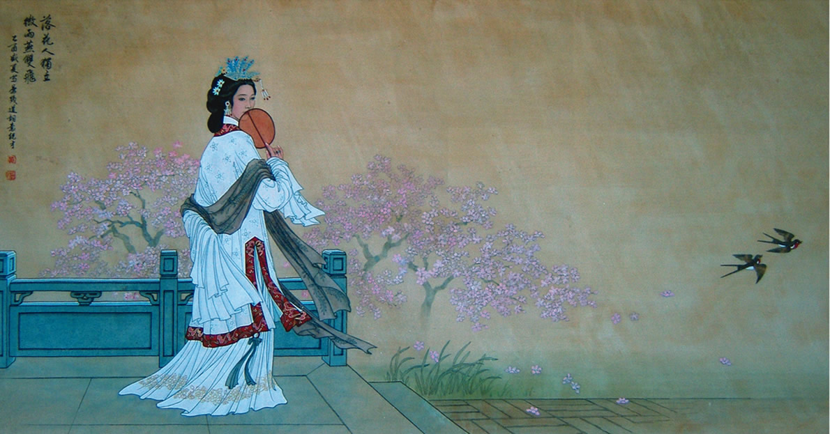 落花人独立,微雨燕双飞。