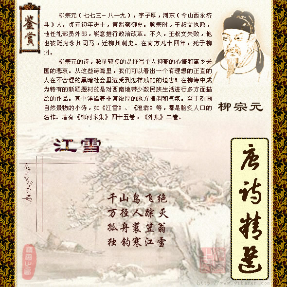 诗采用入声韵,韵促味永,刚劲有力。历代诗人无不交口称绝。千古丹青妙手,也争相以此为题,绘出不少动人的江天雪景图。