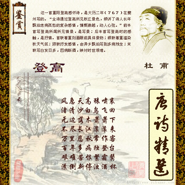 这一首重阳登高感怀诗,是大历二年(767)在夔州写的。“全诗通过登高所见秋江景色,倾诉了诗人长年飘泊老病孤愁的复杂感情,慷慨激越,动人心弦。”前半首写登高所闻所见情景,是写景;后半首写登高时的感触,是抒情。首联着重刻画眼前具体景物;颔联着重渲染秋天气氛;颈联抒发感情,由异乡飘泊写到多病残生;