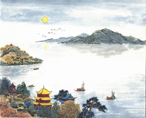 刘禹锡《望洞庭》“湖光秋月两相和,潭面无风镜未磨”配图及翻译赏析
