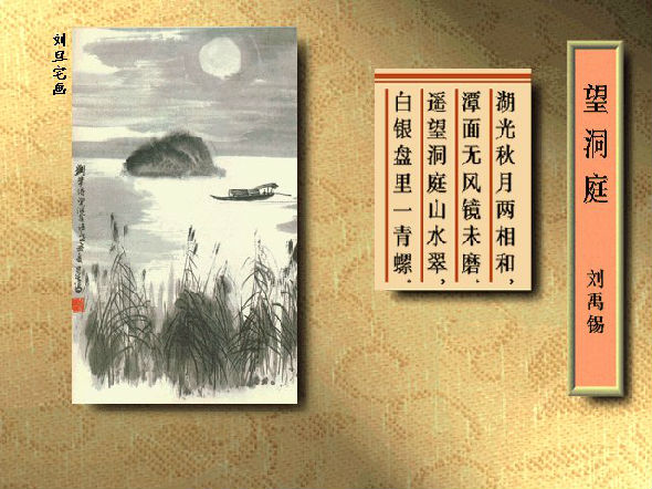 注释:这首诗用比喻的手法描绘了一幅月下洞庭图:皓月之下君山如一只青螺,立于如银盘般平静的洞庭湖水之上。诗人采用了缩景的方法,把八百里洞庭湖水缩为可以摆在案头上的精美的工艺品,可谓别出心裁。短小的诗句之中已见诗人高旷的情怀。