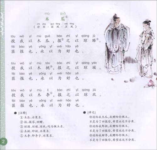 读后感:"投桃报李"这个成语,应当与这诗的立意有关(该成语也出自《诗·大雅》中的《抑》),只不过作为报答的东西更贵重,情意更深厚。本诗在这里说的是男女两情相悦。