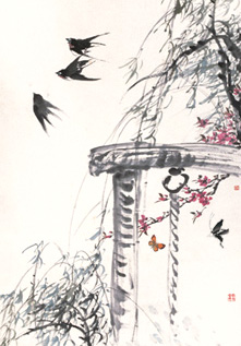 午后静静坐在花阴下,看春风下几只蝴蝶在飞舞。一会儿产生了遐想,这时庭院里早燕飞来了。