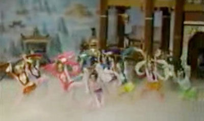 月圆之夜,大型宫廷歌舞酒宴。出场前先是画妆。因是晚妆,为了适合舞场与烛光,画眉点唇,都不妨色泽浓艳。宫娥们刚画完妆的一刻,是何等光彩照人呀!妆毕,春殿上美女如云,她们队列整齐,鱼贯而入,虽是层层娇娘的行列,望之也顿生军旅的浩荡之感。
