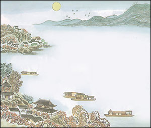 秋夜皎皎明月下的洞庭湖水是澄彻空明的。与素月的清光交相辉映,俨如琼田玉鉴,是一派空灵、缥缈、宁静、和谐的境界。这就是“湖光秋月两相和”一句所包蕴的诗意。“和”字下得工炼,表现出了水天一色、玉宇无尘的融和的画境。而且,似乎还把一种水国之夜的节奏——荡漾的月光与湖水吞吐的韵律,传达给读者了。接下来描绘湖上无风,迷迷蒙蒙的湖面宛如未经磨拭的铜镜。“镜未磨”三字十分形象贴切地表现了千里洞庭风平浪静的安宁温柔的景象,在月光下别具一种朦胧美。“潭面无风镜未磨”以生动形象的比喻补足了“湖光秋月两相和”的诗意。因为只有“潭面无风”,波澜不惊,湖光和秋月才能两相协调。否则,湖面狂风怒号,浊浪排空,湖光和秋月便无法辉映成趣,也就无有“两相和”可言了。[2]
