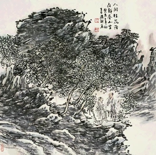 译文二:在这个寂无人声的地方,芬芳的桂花轻轻飘落在地上。静静的夜晚,使这春天的山林更加空寂。月亮升起,惊动了正在树丛栖息的山鸟,它们清脆的叫声在空旷的山涧中传响。