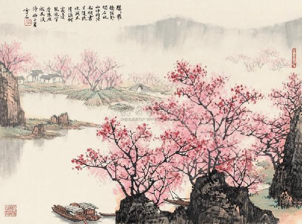 下面画近景。近处,水中露出嶙峋岩石,如岛如屿(石矶);那飘流着片片落花的溪上,有渔船在轻摇,景色清幽明丽。“石矶西畔问渔船”,一个“问”字,诗人也自入画图之中了,使读者从这幅山水画中,既见山水之容光,又见人物之情态。诗人伫立在古老的石矶旁,望着溪上飘流不尽的桃花瓣和渔船出神,恍惚间,他似乎把眼前的渔人当作当年曾经进入桃花源中的武陵渔人。那“问”字便脱口而出。