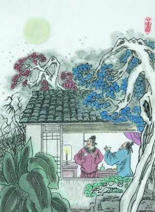 这首诗以近散文化的笔法,古朴的语言,直陈其事,主客互相吟诵诗句,一唱一和,我中有你,你中有我,衷情互诉,洒脱疏放,别具一格。