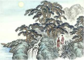 “明月松间照,清泉石上流”,被雨水洗涤后的松林,一尘不染,青翠欲滴;山石显得格外晶莹、剔透新亮;就连月光也像被洗过一样,极其明亮皎洁;山雨汇成的股股清泉顿时流淌于拾级而上的石板上,又顺着山涧蜿蜒而下,发出淙淙的清脆悦耳的欢唱,好似宛转的“小夜曲”奏鸣。“照”与“流”,一上一下,一静一动,静中有动,动中有静,仿佛让人感受到大自然的脉搏在跳动。此时此刻诗人也仿佛觉得自己也被洗净了一般,自然的美与心境的美完全融为一体,创造出如水月镜般不可凑泊的纯美诗境。此种禅意非隐居者莫属。苏轼把此联誉为“诗中有画,画中有诗”的典范之秀句。