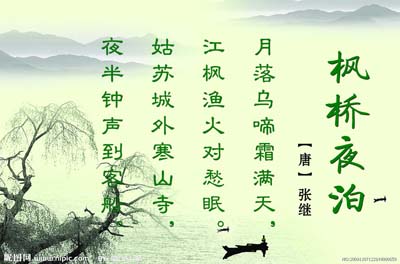 第二句,“江枫渔火对愁眠”。由感觉世界到诗人情绪世界的转变。是诗的第一个起伏。江上渔火点点,岸边枫叶正红。但是面对世事无常和生活的艰辛,孤独的旅人和辛勤的渔人在这漫漫寒霜的秋夜,只能对愁而眠。如果说前两句是写的诗人的感觉世界和情绪世界,那么,后两句则上升到理性世界。这是全诗的最大起伏处。诗的前幅密度极大,十四个字写了六种景象。后幅却特别疏朗,两句只写了一件事:卧闻山寺钟声。但却实现了从感觉世界向理性世界的飞跃,给人无限遐想的空间。