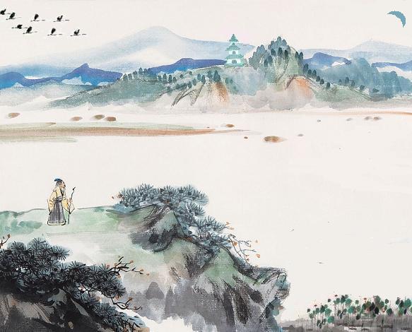 诗人在领略了西湖美妙的秋景后,又把他的目光延伸到远远的钱塘江上。寥廓的江天分外澄澈,更能体会到秋天的明净和秀美。“雷峰塔畔登高望”写他登高远眺,观察的角度也由前面的俯视细察变为放眼纵览。首先映入眼帘的是浩浩荡荡的“钱塘一派长江”。这里的长江是指长长的钱塘江水。下面四句“湖水清,江潮漾。天边斜月,新雁两三行”是细写作者站在雷峰塔上由近及远,登临纵目的眺望过程。“湖水清”说的是脚下的西湖,“水清”固然是由于西湖水色秀美,但恐怕也与秋天有关吧。因为秋天是“潦水尽而寒潭清”嘛!“江潮漾”说的是远处的钱塘江潮。由于钱塘江入海处呈喇叭形,向内逐渐浅窄,海潮涌来时受其约束形成很高的潮头,这就是有名的钱塘江潮。贯云石在这首小令中把此天地间的壮观概括成“江潮漾”与“湖水清”对举,作为余杭诱人秋景的代表,是很有其典型性的。“天边斜月,新雁两三行”则是越过江潮把目光投向更远的天边。斜月之下,几行新雁披着冷冷的清辉向天的尽头飞去,诗人的心被带得很远很远,整个画面也在无限地向前延伸。秋天的清彻、寥廓,诗人心胸的开阔、舒展,通过这无尽的画面很好地表现了出来。