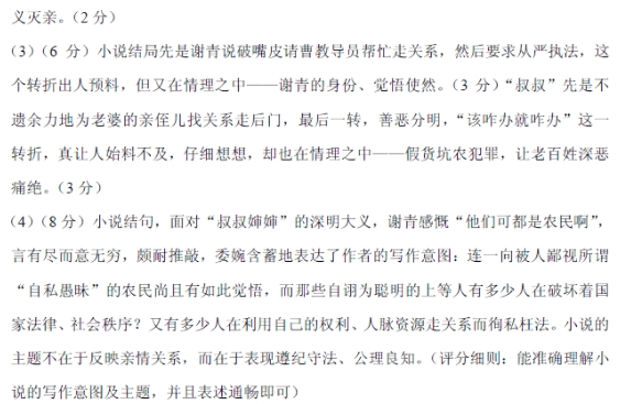 (4)小说结句,作者借谢青之口,感慨“叔叔婶婶可都是农民啊!”表现了作者什么样的写作意图?(8分)