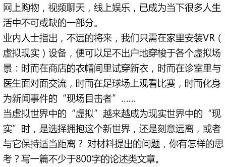 2016年浙江省语文试卷的作文题题目为:VR(虚拟现实)现在已经逐渐走进我们的生活,逐渐变成现实的一部分,比如VR设备足不出户就能环游世界。我们怎么看这一现象呢?应该是接受,还是拒绝,或者是跟它保持一定的距离?根据材料作文,题目自拟。 2016浙江高考语文作文题: 网上购物、视频聊天等在我们生活中越来越普及。有人预言,以后只要装一个虚拟世界的设备,就可以足不出户感受虚拟世界的真实场景…… 当虚拟世界里的“虚拟”,越来越成为现实世界里的“现实”,你是选择拥抱这个世界,还是可以远离他或者保持适当的距离? 题目自拟,写一篇800字论述文。