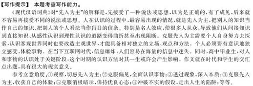 阅读下面的材料,根据要求写作。(60分) 一家视觉工作室,请五个专业摄影师,同一个人拍肖像照。拍摄之前,工作人员分别向摄形师们描述了这个拍摄对象的身份:他是一位白手起家创业致富的百万富翁,他是一名 救生员,他是一个出狱的囚犯,他是一个职业渔民,他是一个成功戒酒的酒鬼。之后,五张肖像照,挂在了一起。每一张照片,都准确、生动、传神、惟妙惟肖地表现了肖像照主人的身份。但这个被摄的人,不是出狱的囚犯,不是救生员,不是渔民,不是百万富翁,不是酒鬼,这五个身份,其实都与他无关。他也不是演员,没有瞬间进入角色的能力。可是,当他被作为囚犯、救生员、渔民、百万富翁、酒鬼之后,摄影们居然将他拍出了这五张迥然不同的脸。 生活中常有先入为主的现象。上述材料触发了你怎样的联想和思考?请结合材料,联系自己的认识和体验,写一篇文章。要求:选好角度,确定立意,明确文体,自拟标题,不要套作,不得抄袭;不少于800字。