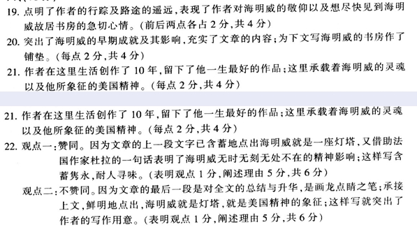 海明威的书房 赵玫 ①我们从迈阿密出发,很快就脱离了美国大陆,驶上了那条著名的国家公路。它所以著名,是因为这条公路是由岛屿连接而成的。便是在这样的行驶中,我们终于来到了基韦斯特。公路的尽头,岛的尽头,也是美利坚的尽头。也许就是为了这个美丽的岛屿,这座优雅的小城,或者就是为了海明威,这条海上的公路才会千辛万苦地铺到这里。 ②我们终于走进海明威住过十年的旧居。这座今天看起来并不豪华的房子,当年在岛上却是独一无二的建筑。它置身于由众多高大植物掩映的绿荫之下,院墙却是用非常质朴且粗糙的红砖砌成的。1931年海明威得到这座房子时已经32岁了。那时候他已参加过“一战”,负过伤,做过多种报系驻欧洲的记者,走上了文学之路。待这个年轻作家雄心勃勃地回到美国时,他的两部著名小说《太阳照常升起》和《永别了,武器》都已经完成,并赢得了“迷惘一代”的称誉。成为新生代美国文学的象征之一。 ③朋友请来一位博物馆的研究员,为我们一行做深入的讲解。他穿着海明威常穿的那种花衬衫,戴着海明威也曾戴过的那种草帽。说他看起来有点像海明威,他于是自得,说一天中总有几位游客会这样说。他说他喜欢海明威的作品,进而对海明威住过的这座房子满怀感情。所以他讲解的不单单是这座房子,而是海明威传奇的人生,他的创作,以及他与这座房子的恩恩怨怨。 ④然后便是海明威的书房了。这是老海为这座美丽岛城留下的最有价值的东西。一个很大的房间,几乎占据了整整一层楼。房间四面都有窗户,每个角落都是通透并且明亮的。透过那扇不能打开的门看清了海明威写作的空间。四壁书架上摆满了书,圆桌上放着一架陈旧的甚至锈迹斑斑的打字机。遍布于房间各个角落的纪念品大多来自欧洲、非洲以及南美洲。想不到的是,那位为我们讲解的研究员竞破天荒地打开了书房的门,让我们进去体验老海的精神领地。我站在门外,有点迟疑。在他的再三邀请下,我才诚惶诚恐地走进了这间不对外开放的书房。然后他开始讲述老海写作的故事,说这里完全保持了海明威当年使用时的原样,他的皇家牌打字机,他制作古巴雪茄的椅子,他所收集的各种纪念品等等,都在原地。他还说海明威喜欢清晨写作,每天早上6点开始工作。六个小时后便离开这里,或者去海里钓鱼,或者和朋友们一道去他喜欢的酒吧。 ⑤就是在这间书房里,海明威创作了他一生中最好的作品:《死在午后》、《非洲青山》、《获而一无所获》、《丧钟为谁而鸣》等长篇小说,以及《乞力马扎罗的雪》那样令人震撼的短篇。岛上的人们说,海明威将他一生中最好的作品都留在了这里。于是那以后漫漫20年的写作生命中,就只剩下一部不朽的《老人与海》了。 ⑥是的,有点诚惶诚恐地站在海明威的书房中央。面对四壁摆设的每一件物品。他的行囊、他的烟斗、他的画架、他的鹿角、他的烛台以及漂亮的顶灯…… ⑦研究员突然把圆桌旁的那个椅子指给我,他的意思是问我愿不愿意在海明威曾经写作的这个桌前坐一坐?于是坐下,不知在亲近着一种怎样的激情。紧接着,他又问,愿不愿意尝试着去敲打那台老掉牙的打字机?于是盛情难却地敲击着一个个圆形的字母键。这个旧得不能再旧的英文打字机于是跟随着我的手指发出有节奏感的声音。这是唯有在美国黑白电影中才能看到的景象。而我,在那一刻,竞然就坐在海明威的椅子上,敲击着他的键盘。 ⑧当时的那种感觉简直难以置信。还从来没有这么近距离地亲近着一位大师的以往。只是坐在那里,坐在海明威坐过的椅子上,怯怯地敲击着,海明威曾敲击出无数杰作的打字机。 ⑨然后起身,退出那种神圣的感觉。只是觉得太不可思议了,能如此触摸这基韦斯特的、美国的、也是世界的骄傲。 ⑩然后告别海明威。告别这座承载了海明威那么多优秀作品的大房子。在二楼的回廊中,转身就能看到那座照耀着整个海岛的灯塔。那灯塔昭示着,海就在不远处的地方生生不已地涌动着。用了法国作家杜拉的感觉去形容:在特鲁维尔,那里有海。白天,黑夜。即使你看不到海,但那海的意念却始终都在…… 11是的,如今海明威就是那座灯塔,以他所象征的美国精神光照天宇。于是人们不再会忘记基韦斯特。这座美丽的岛城,就意味了海明威。 19.文章第①②段中连用两个“终于”有何含意?(4分) 20.文章在第②段介绍了海明威的经历,这样写有何作用?(4分) 21.作者为什么说“这是老海为这座美丽岛城留下的最有价值的东西”?(4分) 22.有人说,文章的最后一段可以删掉,你觉得呢?请联系全文谈谈自己的看法并阐述理由。 参考答案