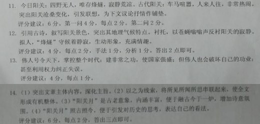 阳关月 杨之水 从敦煌城里坐了开往南潮的最后一班车,到阳关下车,已是薄暮时分,汽车在阳关并没有 站点,招呼了司机,才在这停了下来,看着汽车呼啸而去,消失在伸向天边的公路上,好像一 下于被孤零零抛在旷野中一一大漠黄昏,好有几分凄凉. 四野无人,只觉得那斜斜的残阳,比我脚步更决,一点点向平之 急地退下去. 关一一不过是墩墩山一个汉代的烽燧。在墩墩山周围绕行,烽燧下面的坡地,猛踏一脚下去, 空空有声,里面正不知埋藏了何等的秘密.山前的茫茫砂碛,被称作古董滩。据说阳关故址的 确定,便是依据滩上发现的大量历史遗物,如今这里仍有不少陶片之类的古物遗存 距这里95公里,是党水之源的雪山——阿尔金山。在阳关故址碑前极目四望,方圆百里旷无人迹,天地之间除了几只苍蝇嗡嗡飞着,再听不到别的声音。有一首无名氏的《瓜沙道中》诗:“阳关古道接大荒,官杨零落不成行。阴沉日色连云白,暗淡风沙人寒黄。鸿觅稻梁衔矢石,人拼骨肉战冰霜。唐蕃汉垒今何在,秦月依依照古疆。”回味诗句,立空旷中,仍能体味到那萧萧的悲凉。幕色四合,视野中只有墩墩山的烽燧兀立在高阜上,守候着一片静寂,天边 的最后一抹蜂紫,渐渐转作深蓝,一点一点地,黑定了. 想起一个红柳娃的故事:茫茫大漠的红柳树间,有一尺来高的小人叫红柳娃,捉到了,会哀哀叩头求告。放他走,则跑出一段路又折回身。仍是遥遥的叩首,屡奔屡止,直至追不及。这很像是幻觉。而人在极度寂寞中,是会产生这种幻觉的。 不过,上溯两千年,这里何尝寂寞呢。阳关以南是玉门,那时,车辚辚,马萧萧,使者,商人,冠盖相望,不绝于道。金戈铁马,汉军挥师西向,更是屡屡打破旷野的寂寞。那正是汉武帝的辉煌业绩之一。 正式纳入政治轨道了;疆城的开辟也达于空前,他雄才大略,号令天下,统帅一切,举全国之 力不容置疑地建立他所要的非常之功,但后世对汉武帝的评价并不一致。蓬莱银阙、露博金掌 的求仙生涯不必说,就是开西域击匈奴,也有好大喜功、穷兵黩武之讥.只是,仍然要说他是 伟大的.不仅在于他有能力成就他的功业,也同样在于他有能力破坏自己的功业.因为他的伟 大永远与权力联系在一起,晚年他发布了“轮台罪己之诏”,纠正了方针大政上的失误,但连 这种自我批评,也只能用权力的形式表现出来.伟人的时代,常常是伟人一个人的时代. 辉煌的、悲壮的、惨惨戚戚的历史,都融化在古董滩上,又被日精月华铸为荒寂的、苍凉的一片。这一片辽远的寂静,没有虫声鸟语,此刻连苍蝇的嗡嗡声也早消逝了“知古不知今,谓之陆沉;知令不知古,谓之盲 ”这月王充的求实精神。但所谓知今,也只能知一己目之所及的今;知古,也只能知一己目之所及的古一一这“所及”要受多少限制! 就一定见不到月亮?那么明月高悬的时候,还能见到星光灿烂吗? 11.文中今日阳关和古代阳关各有什么特点?采用古今对比的写法有何作用?(6分) 12.第四段文字在表达上很有特色,请简要赏析。(4分) 13.分析文中“伟人的时代,常常是伟人一个人的时代”这句话的含义?(4分) 14. 结合全文内容,探究作者以“阳关月”为题的意图。(6分) 参考答案 今日阳关;四野无人 ![]()