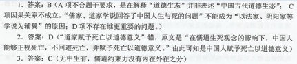 中国古代道德生态浅论 所谓道德生态,指的是社会道德各形态之间以及社会道德与其他社会资源之间平衡的、稳定的、有序的、和合的联系。建立良性的道德生态是一个社会进步的重要标尺,是生态文明的本质特征。 中国古代道德生态根植于农耕文明和宗法制社会基础之上,它的形成是一个动态的、历史的、发展的过程。西周初期周公制礼作乐,奠定了中国礼乐之邦、礼乐教化的基础。到西周末年,礼崩乐坏,宗法制观念受到了严重的挑战,有识之士展开了“百家争鸣”,儒家以恢复周礼为己任,形成了儒家的仁义道德;墨家站在小生产者的立场挑战宗法制道德;道家则打着道德的大旗,尚无贵虚,否定宗法制观念……汉武帝时期,“罢黜百家、独尊儒术”,儒学定于一尊,成为官方的意识形态;而道家思想也潜滋暗长,成为儒家“显学”强有力的支撑。至此,中国古代道德生态形成了以儒家、道家道德学说为主干,以法家、阴阳家等学说为辅翼的基本格局。后来,佛教、伊斯兰教乃至基督教文化传入中土后,中国古代道德生态兼容并包,才形成了一个趋于良性的道德生态系统。 儒家、道家为什么会成为中国古代道德生态的主干呢?主要原因在于儒家、道家学说回答了中国人生与死的问题——这是人类普遍的、重大的道德关切,而墨家、法家、阴阳家等学说,间或涉及生与死的问题,但都没有镛、道两家说得全面、复杂和深刻。儒家、道家学说在生与死的问题上路径是迥然相反的,儒家是由生入死,道家则是由死入生。儒家对死的问题较为回避,不语怪力乱神,但儒家讲究厚葬,强调镇终追远,“以生来事死”,让生人感悟死亡,或者说赋予死亡以意义。道家的基点是无.他们的学说从无展开,又复归于无。而生命的过程则是从无开始,而死(无)则是其母、其根,人们从出生到死亡,生而死,死而生,就如春夏秋冬四时交替一样,自然而然。在儒道生死观念的影响下,中国人能够正视死亡,不回避死亡,并赋予死亡以道德意义。 从表面上看,孔子以恢复周礼为己任,而老子则是以批判为旨归,儒、道两家仿佛水火不相容,但实际上是与阴阳、乾坤一样,虽是对立的两面,但又同源互补,《老子》四十二章中说。万物负阴而抱阳.冲气以为和”,“和”是阴阳、乾坤、儒道追求的一个根本性的目标,是中国古代道德生态的精髓。儒道互补即如太扳图中的阴阳鱼一样,阴阳此消彼长,此长彼消,实现一种阴阳的和合。也可以说儒家是“正”的方面,而道家则是“负”的方面。在善的原则指导下,儒家所谓仁、义、礼、智、信、温、良、恭、俭、让都是人性中积极的、正面的响应,所以说,儒家道德更多的是一种要求,或者说一种束缚。而道家则采用的是一种“道德减法”,主张绝仁弃义,批判儒家礼法,追求自然天成。 中国古代道德生态形成后,一方面产生了强大的向心力、凝聚力和持久的生命力,另一方面又产生了强大的约束力,对道德个体、家庭乃至族群产生制约。儒家“三纲五常”观念产生以后,所谓的纲常伦理就对人们的日常行为具有极大的约束力;而道家的真的原则,则让人们努力去伪存真,保持自己的自然天性,这同样也是一种约束。在历朝历代的更替过程中,政权在巩固统治的过程中选择儒家作为统治的基础,这虽是巩目其统治的需要,但从另一角度来说,也体现了儒家道德强有力的约束力量。(选自(光明日报》2014年07月16日14版,有删减,作者张洪兴) 1.下列关于文中“中国古代道德生态”概念的表述符合原文意思的一项是(3分)( A道德生态是社会道德各形态之间以及社会道德与其他社会资源之间的联系,而这联系是平衡的、稳定的、有序的、和合的,“和”是他的精髓。 B.中国古代道德生态建立在农耕文明和宗法制社会基础之上,它的形成过程是动态的、历史的、发展的,并逐步形成了一个趋于良性的道德生态系统。 C.因为儒家、道家学说回答了中国人生与死的问题,所以中国古代道德生态形成了以儒家、道家道德学说为主干,以法家、阴阳家等学说为辅翼的基本格局。 D.中国古代道德生态形成后,不仅产生了强大的向心力、凝聚力和持久的生命力,更重要的是对个体、家庭乃至族群产生了强大的约束力。 2.下列选项对文中提到的儒家和道家的表述有误的一项是(3分)( A.儒家和道家都是中国古代道德生态的组成部分,在儒学成为官方的意识形态时,道家思想也在潜滋暗长,成为儒学强有力的支撑。 3.下列选项对文章信息概括分析有误的一项是(3分)( 参考答案 ![]()