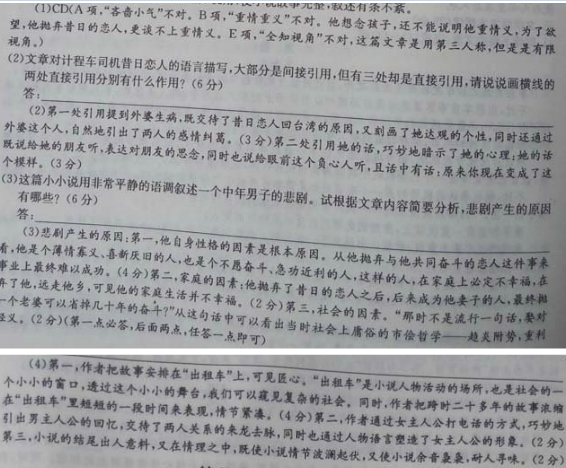重逢 吴念真 事业失败之后才发现除了开车之外,自己好像连说得出口的专长都没有,所以最后他选择开出租车。 不过,出租车在市区里跑还是容易碰到以前商场上的客户或对手,“熟人不收费,自己倒贴时间和油钱这不算什么……,最怕遇到的是以前的对手,车资两百三给你三百块,奉送一句:不必找啦,留着用!”外加一个奇怪的眼神和笑容,那种窝囊感让人觉得不如死了算了! 所以后来他专跑机场,因为跑机场比较不会遇到类似难堪的状况,而且也不用整天在市区没目的地逛,让自己老觉得像一个已经被这个战场淘汰的残兵败将,或者像中年游民一般地无望。 不过,他也承认跑机场的另一个奢望是如果前妻带着孩子们偷偷回国的话,说不定还有机会睹上他们和孩子们见上一面;“离婚后就没见过……,我都只能凭空想象他们现在的模样。” 孩子和前妻一直没碰上,没想到先碰到的反而是昔日的爱人。 他说那天车子才靠近,他就认出她来了。“曾经那么熟悉的脸孔和身体……,而且除了发形,十几二十年她好像一点也没变。” 上车后,她只说了一个医院的名字和“麻烦你”之后就沉默地看着窗外,反而是他自己一直担心会不会因为车子里的名牌而被她认出来;不过,她似乎没留意,视线从窗外的风景收回来之后,她便拿出电话打起来。 听得出,第一通电话听得出她是打回澳洲雪梨的家,听得出先生出差去英国,她轮流跟两个孩子说话,要一个男孩不要为了打球而找借口不去上中文课,也要一个女孩钢琴要好好练,不然表演的时候会出糗,然后说见到外婆之后会替他们跟她说爱她等等,最后才听出是她母亲生病了,因为她说:“我还没到医院,不过妈妈相信外婆一定会很平安。”① 他还记得她母亲的样子和声音,以及她做的一手好菜,更记得两人分手后的某一天,她到公司来,哽咽地问他说:“你怎么可以这样对待我女儿呢?”那种颤抖的语气和哀怨的眼神,真让人忘不了。 打完家里的电话,接着打的是她公司,利落的英文、明确的指令加上自然流露对同事的关心,一如以往。他们大学时候就是朋友,毕业之后他去当兵,而她在外商公司做事;退伍后,她把一些客户拉过来,两个人合伙做,三年后,两人公司变成二十几个人,而他却莫明其妙和一个客户的女儿发生了一夜情…… 说莫明其妙其实是借口。他想,到现在也没什么好不承认的……,一来是新的身体总比熟悉的刺激,还有……这个客户公司的规模是我的几百倍,那时不是流行一句话:娶对一个老婆可以省掉几十年的奋斗? 最后车子经过敦化南路,经过昔日公司的办公室,两旁的台湾栾树正逢花季,灿烂的秋阳下一片亮眼的金黄。 后座当年的爱人正跟之前公司的某个同事话家常,说台北说澳洲说孩子说女人到了一个年龄阶段的感受,然后说停留的时间以及相约见面吃饭,说:“让我看看你们现在都变成什么模样。”② 车子最后停在医院门口,他说他还在躲避,也在犹豫要不要跟她收费或者为她打个折,没想到后头的女人忽然出声,笑笑地用极其平静的语气跟他说:“……我都已经告诉你所有近况、告诉你现在的心情、告诉你对一些人的思念……,什么都告诉你了,而你……连一声简单的问候都不肯跟我说?” (1)下列对小说的理解和分析,恰当的两项是(5分)() A.文章的前三段不仅交待了这个出租车司机的困奢处境,而且也可以看出他吝啬小气、自落好强的个性。 B.他跑机场的另一个奢望是希望碰到前妻和他的孩子们,说明他其实很想念家人,很揭望家的温暖,可见他是一个重情重义的人。 C.出于好奇,他一直在用心地倾听昔日恋人的电话,出于自尊,他不希望昔日的恋人认出他,但出租车里他的名牌为结尾情节的突转埋下了伏笔。 D.文中写车子经过敦化南路他昔日的办公室时,对开得灿烂的台湾栾树进行了特写,这一处景物描写反衬出他此刻心境的黯淡。 E.这篇小小说从出租车司机的视角来展开叙述,通过他的内心独白和他“昔日恋人”打电话的内容,将回忆与现实联系起来,这种全知视角,使小说故事完整,叙述有条不紊。 (2)文章对计程车司机昔日恋人的语言描写,大部分是间接引用,但有三处却是直接引用,请说说画横线的两处直接引用分别有什么作用?(6分) (3)这篇小小说用非常平静的语调叙述一个中年男子的悲剧,试根据文章内容简要分析,悲剧产生的原因有哪些?(6分) (4)这篇小小说在构思上有哪些巧妙之处?请作简要分析(8分) 参考答案