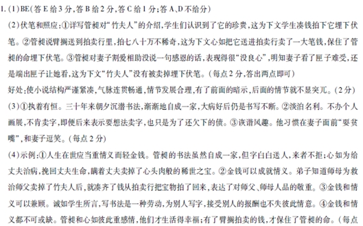 竹夫人 徐慧莽 管昶浸润书法三十年了,三十年来朝夕沉在其中,渐渐地也有了自己的面貌,所谓自成一家了。有了点名气后,也常有一些后生拜在门下,也常有人上门来讨字。 然而,管昶的物质生活并没有多大改观,手头一有闲钱除了添置一些纸墨笔砚.收集一些古籍碑帖之外,其余一概用光,直到四十多岁才娶了太太。太太比他小十岁,原是朋友筱安之妻,丈夫病逝后才嫁给了管昶。 管昶的学生说,老师,你该办个人书展了!某某、某某的字远不及你,办了个展后名气大了,现在求字的人不断。管昶说,不办!我才不操那劳什子心!热闹一下子,字就好上去啦?学生说,那你的字也不能老是送人,来者不拒。郑板桥那么清高的人还卖字卖画呢!用字换钱也不丢人,至少换了钱房子可弄得再大些。管昶笑了,管昶说,嘿,抬举你老师了,我哪能跟郑板桥比呢!再说我又不缺烟酒钱,三间屋子能搁下两张书桌够大了,再大,收拾起来费事,小偷也容易上眼。 一日,管昶在家中与几个弟子闲谈,七扯八扯话题扯到了妻子心如身上。谈到兴处,管昶从里屋捧出一只红木匣子。打开匣盖,取出两块一尺来长、三四公分厚的竹片来。 竹片润滑如玉,呈琥珀色,上面精雕细刻着梅花和竹子,像是年代久远了。管昶抚着竹片对弟子说,不认识吧,这叫臂搁,俗称“竹夫人”,也是过去的文房用品,写字作画时垫在手臂下可借点力,夏天也可防手汗落到纸上。这对臂搁是宋代的东西,传下来不容易,品相又好,现在送到拍卖行,拍个七八十万不稀奇…… 这件宝物正在几双手中传来传去,夫人心如外出回来看到这一幕,咳嗽了一声,笑了笑,眉头又皱了皱。管昶赶紧将宝物裹上丝绒,放进匣子。 弟子走后,心如沉下脸来对管昶说,我的东西,你拿出来现什么宝呢?管昶笑说,你的不也是我的嘛!“瞎说,告诉过你,这是筱安祖上传下来的东西,是筱安的爷爷喜欢我,才送我的,你可不要在上面动什么脑筋!” 管昶用手刮刮夫人的鼻子,嬉皮笑脸逗道:还是旧人好哇!一口一声筱安,赶明儿我去拍卖行拍掉,换套大房子算了,省得你老恋着旧人的东西不放!“你敢,看我不打你!”夫人向他擂起了粉拳。管昶赶紧捧起匣子逃到里屋。 天有不测风云,宝物到底还是没保住。过了一年,菅昶肝区痛了一阵,检查下来竟是肝硬化晚期。此时再后悔平时烟酒过头也无用了。一线生机是做肝移植,但这笔大钱又哪里拿得出!痛定思痛,心如瞒着丈夫只得把一对臂摘托人送进了拍卖行。这样,最后总算保住了管昶的命。 管昶病好后,仍是书写不断,只是断了烟酒。心如劝他多歇歇,管昶笑笑说,写字就是最好的养生,再说我也要想法卖字了,否则这欠下的一屁股债,何时才能还清呢!心如扑哧一笑,用手点着丈夫的额头说,省省吧,实话告诉你,没欠什么债,只是把筱安家的那对宝贝卖了! 管昶一听笑了起来,说:好好好!没欠债就好!心如一听,柳眉一竖,眼睛一瞪:好什么好!你欠了我的债,一句感激的话也没有,你这人怎么这么没良心!你知道这对臂搁出手时我有多心疼! 管昶仍是笑嘻嘻地,将妻子揽进怀里逗她:你想,人与物哪个重要呢?我当然比那对“竹夫人”重要多了,是吧’再说还是卖了好,省得你睹旧物思故人,也省得我常常吃醋,这样不是挺好吗’ “没艮心!”心如将丈夫一把推开,重重地叹了口气。 “臂搁没有了,匣子不是还留着吗?看看匣子也可以解解馋嘛!”管昶跑进里屋端来匣子,安慰妻子。“不要看,看了心里更不好过!”“真的?那我下次把匣子送人就是,免得夫人难过。”听丈夫这么一说,心如赶紧把匣子抢了过来。 打开匣盖,一对“竹夫人”裹着红丝绒,依然娴静地躺着。疑是梦,心如使劲揉眼睛。 “晃眼了吧?猜出你卖掉了心头肉,我也心痛啊!学生知道后,还没等我开口就赶紧凑了钱又从拍卖行拍了回来……”管昶不紧不慢地说着。 心如的喉咙噎住了,泪扑簌蔌滚落下来. (选自《今生来世》,有删改) (1)下列对这篇小说思想内容与艺术特色的分析和鉴赏,最恰当的两项是(5分) A管昶的学生劝说管昶办个人画展,卖字换钱,并为老师鸣不平,说明他们并不了解老师的精神境界,是世俗化的眼中只有名利的人。 B臂搁是宋代传下来的东西,又是筱安祖上传下来的东西,是筱安祖父送给孙媳的礼物,这些说明臂搁很珍贵,在心如心中分量很重。 C心如外出回家看到臂搁被人传来传去,当即示意管昶,让他赶紧包好宝物,放回匣子,这说明心如对宝物的珍视,以及心如性格的强势。 D管昶直到四十多岁才娶了心如,可是心如念念不忘筱安,这为家庭生活蒙上阴影,所以管昶说出打算拍掉臂搁及把匣子送人的话语。 E“竹夫人”是小说的线索,把小说的内容组织起来,有条不紊;又是纽带,把小说中的人物联系起来,体现了夫妻深情、师徒厚意。 (2)小说有多处伏笔和照应,请举出两例,并说说这样处理有什么好处。(6分) (3)小说在刻画管昶这个形象时,突出了他的哪些性格特征?请简要分析。(6分) (4)小说讲述的是关于金钱与情义的故事。小说关于金钱与情义的话题表达了哪些观点?请结台全文谈谈你的看法。(8分) 参考答案
