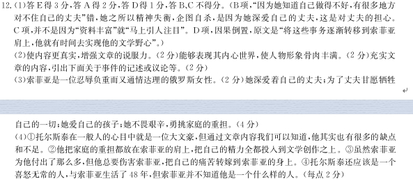 (1)下列对传记有关内容的分析和概括,最恰当的两项是(5分) ( ) A.当托尔斯泰躺倒在阿斯达波沃火车站的站长室的消息传出时,来了很多人,大家只想知道托尔斯泰的情况,因为他们都非常关注这位伟大的作家。 B.当索菲亚得知丈夫离家出走时,她一度精神失衡,企图自杀,因为她知道自己做得不好,有很多地方对不住自己的丈夫。 C.索菲亚的《我的人生》真诚、委婉,把自己丰富的内心世界表达出来,这部作品因为资料丰富,一经面世马上引人注目。 D.当初的列夫·托尔斯泰一板一眼管理庄园,事事亲力亲为,后来他为了实现自己的文学野心,把各种事务转移到索菲亚的肩上。 E.虽然索菲亚担当着“恶神”和“剥削者”的罪名,但她还是把托尔斯泰的书籍和物品进行了大盘点,她用自己的行动诠释什么叫作“忍辱负重”。 (2)文中多处引用索菲亚的话,这些引用有什么作用?(6分) (3)文章结尾处说:这不也就是索菲亚·托尔斯泰的魅力所在吗?结合文章内容概括索菲亚的魅力是什么。(6分) (4)文章虽然主要写的是索菲亚,但对托尔斯泰也有涉及,通过文章中对托尔斯泰的描写,你对托尔斯泰有什么样的认识?(8分) 参考答案 ![]()