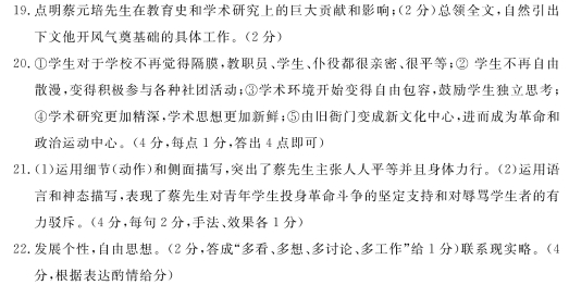 ⑦蔡先生今年七十四岁,在他自己,辛苦一生,已经到了该休息的时候,可是我们如何舍得他呢?他在法国巴黎大学、德国莱比锡大学研究哲学、美学、人类学、文明史等等,虽然归国后因为人事繁忙,自己没有写出多少东西,但他已把他所学的一起用到实际上来了。他希望人家发展个性,他鼓励人家自由思想。他唯恐别人不知天地之大,他又唯恐别人成见之深;他要人多看,多想,多讨论,多工作,使得社会一天比一天进步,人生一天比一天快乐。这一个他的中心主张,虽则他自己没有明白说出,但是知道他的人一定是感觉得到的。这就是他在中国史上最大的贡献,也是将来的青年们所永远不能忘记的人生指导。 19.简析第①段在文中的作用。(4分) 20.蔡先生给北大带来哪些变化?请简要概括。(4分) 21.赏析文中画线的句子。(4分) (1)记得蔡先生每天出入校门,校警向他行礼,他也脱帽鞠躬,这班“小”惯了的仆人看了吐出舌头来。 (2)蔡先生就正色说道:“只有青年有信仰,也只有青年不怕死,革命工作不让他们担任该什么人担任!” 22.文章第⑦段中“他的中心主张”指的是什么?根据个人理解谈谈这一主张的现实意义。(6分) 参考答案 19.点明蔡元培先生在教育史和学术研究上的巨大贡献和影响;总领全文,自然引出下文他开风气奠基础的具体工作。