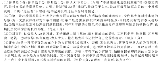 “出一点问题,先在田成山身上查根子,找背景,这是一种什么习惯呢?”焦发祥盯着杨书记,“实在说,刘治泰这样的作风问题并不难纠正,难就难在我们的这个可怕的习惯!你想想,这到底是一种什么习惯呢?”杨书记红着脸,渗出汗水来了。 两人告别时,焦发祥手里挑着一只灯笼,笑着说:“把这只灯笼送给你做个纪念。关于那个‘习惯’问题的答案,就在这只灯笼里。”杨书记红着脸,接过了那只小灯笼。(有删减) (1)下列对这篇小说思想内容与艺术特色的分析和鉴赏,最恰当的两项是(5分)( A.小说写了一个农民田成山不满庄基地划拨的政策,与村支书发生纠纷后,又得不到乡政府的妥善解决,于是一步步向上级反映的故事。 B.标题“灯笼”是小说的线索,使情节围绕田成山打灯笼“找真理”展开,同时标题有象征意味,一定程度上揭示了不正常的干群关系。 C.小说的人称运用灵活多变,总体采用以焦发祥为视角的第三人称,为了突出事件的真实性,补叙田成山与村支书纠纷时又用第一人称。 D.小说语言朴实生动,口语化,富于生活气息与地域色彩,特别是田成山的人物语言,细腻传神地揭示田成山的农民身份与情绪心理。 E.小说的次要人物杨书记在情节发展中起着穿针引钱的作用,他既是田成山与村支书纠纷的见证者与处理者,也使得故事情节一波三折。 (2)小说中多次提到清水湾的好山好水与田野农作物的用意是什么?请结合小说内容,具体分析。(6分) (3)小说塑造了村支书刘治泰一个怎样的形象?请结合小说内容,简要分析。(6分) (4)你对文末焦发祥提到的“习惯”如何评价?请用一句话进行表述;再结合小说内容,探究这种“习惯”的具体表现。(8分) 参考答案