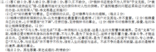 相关链接 ①杨绛,中国著名的作家、翻译家。 ②你要不与人争,就得与世无求,同时还要维持实力准备斗争。你要和别人和平共处,就先得和他们周旋,还得准备随时吃亏。(杨绛《走到人生边上》) ③杨绛高寿的秘诀除了修身养性外,更多的来自内心的安宁与淡泊。生活中的她的确几近“隐身”,低调至极,几乎婉拒一切媒体的来访,隐于世事喧哗之外,陶陶然专心治学。 (《致敬杨绛:平和睿智的百年人生》) (1)下列对材料有关内容的分析和概括,最恰当的两项是(5分) A.杨绛的成才离不开家庭和学校的熏陶。她的父亲说话通情达理,出口成章,他的母亲有文学修养,她在启明学校受到天主教姆姆的爱心感染。 B.钱钟书还完全不为人知的时候,杨绛就已经成名,特别是她写的几个剧本被搬上舞台后,钱钟书在文化圈里被人介绍为“杨绛的丈夫”。 C.杨绛作为一个大家闺秀,第一次去菜市场难免会有些点尴尬,所以钱钟书陪她一起去买菜,他们的生活简单朴素,却也能相互关爱、体贴。 D.“我确信,灾难性的‘文革’时间再长,也必以失败告终,这个被颠倒了的世界定会重新颠倒过来”,这一句话表明杨绛的政治远见。 E.本文采访者提出的问题具体而细致,使读者能深入了解人物的内心世界,遇到敏感的问题还采取迂回式提问的办法,从侧面深入。 (2)纵观这篇采访,采访者所提的问题可以归纳为哪几个方面?请简要回答。(6分) (3)杨绛由宽裕的娘家嫁到寒素的钱家,为什么没有“下嫁”的感觉,请作简要分析。(6分) (4)有人说“不与人争,与世无求”是一种消极的人生态度。请你结合材料和现实,谈谈你的看法。(8分) 参考答案