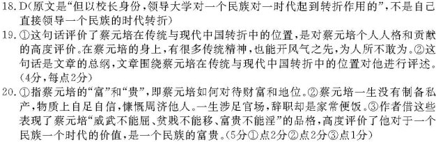 二 18.下列对材料有关内容的分析和概括,不正确的一项是(3分) A.蔡元培一生为国家社会服务,地位不可谓不高,但他没有谋私谋家,常常捐助公益事业,接济困难亲友学生。在其旅居香港之时资助广东籍诗人廖平子。 B.蔡元培不为官场习气所染,自食其力,公派留学无法实现之时,放下身段做家庭教师,还通过同乡同上海商务印书馆商洽,为该馆著文编译。 C.蔡元培不仅是一位敎育家,更是一位以国事为念的国士,每每遇到学潮、罢工、政变之事,他都能以实际行动表明态度,追求正义不趋附强权荣华。 D.各国名大学的校长在学科上往往卓有贡献,但能领导一个民族产生时代转折的,蔡元培几乎是唯一的;他在这一方面的地位甚至可以与文艺复兴的先驱但丁相提并论。 19.文章说“蔡元培可谓传统中国的最后一人,又是新时代的最初一人”。分析这句话在文章中的作用。(4分) 20.文章标题是“蔡元培的富贵”,结合材料谈谈你对标题内涵的理解。(5分) 参考答案