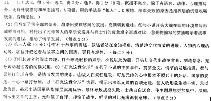 打完这盘台球 (法国)都德 仗已经打了两天。 这些兵士是在倾盆大雨之下,背上背着背包度过这一宵的,因此都疲惫不堪。可是你看已经长长的三个钟点了,就任凭他们手扶着枪,在大道的积水滩里,被雨水渗透的 田野烂泥里挨受着入骨的寒气。 他们在这里干什么呢?情况怎样了呢? 那些尊大炮,炮口向着丛林,好象在窥视什么东西。掩蔽起来的机枪牢牢瞄着天际。 一切都准备齐全,只待进攻。为什么不进攻呢?还等待什么呢? 原来是等候命令,而总司令部却迟迟不下命令。 可是总司令部并不远。就是这座路易十三式的古堡,被雨洗过的红砖在半山坡的矮树丛中闪闪发着光,平整的绿色浅草地夹在两行盛开的盆花之间,一直伸展到正房的阶 前。饭厅的窗户都面临大门石阶开着,从窗口望进去,可以看见杯盘狼藉的饭桌:拔去 塞子的酒瓶,暗淡无光的空酒杯,都憔悴地留在弄皱了的台布上。在隔壁屋子里,发出 说话的语声、笑声、台球的滚动声、互相碰杯声。原来元帅正在打他那盘台球,这就是 军队为什么在那里等待命令的缘故。元帅一打上台球,天塌下来他都不管,世上更没有任何东西可以阻碍他把这盘球打完。 打台球嘛! 这是这位伟大军人的癖好。他站在那里,严肃得跟身临战场一样,穿着军礼服,胸前挂满了勋章,眼睛冒火,两颧通红;宴会,赌兴,酒意都催得他劲头十足。他的副官 们众星捧月似地围着他,殷勤恭顺,他每打一球,他们便钦佩叹赏得五体投地。 跟元帅打台球的对手是一位参谋本部的矮小的大尉,他是打台球的第一把能手,能 够把世界上的所有元帅打个落花流水,可是他懂得和他的长官之间应该保持一种表示敬 意的距离,他留着神不要打赢,可也不要输得太容易。他正是一位人们称为有前途的军 官。“留神!小伙子!元帅已有了十五分,你是十分。应该照这样对付到底;对你的晋 级来说,这比在外边跟那些人一起,让淹没大地的泉涌似的雨水浇着,用处大得多。” 这大尉就这样心里默念着。 这盘球打得真精彩。象牙球滚来滚去,互相挨身擦过,两色交错着。突然,天上闪 过一发炮弹的火光。一阵隆隆的响声震得玻璃颤动。大家都吓了一跳,焦虑地你看看我, 我看看你。只有元帅什么也没看见,什么也没听见;他哈腰歪在台子上,正在琢磨一杆子“嘬球”的绝妙效果。这是他的拿手好戏,嘬球的效果!…… 看!又是一片火光,紧跟着又是一片。大炮一发跟着一发,一发比一发快。副官们都奔到窗口。莫非普鲁士人真的进攻了? “让他们攻吧!”元帅拿粉块擦着球杆头说,“该你啦,大尉。” 这时候骚乱更厉害了。大炮的震撼声中,还夹杂着机枪的哒哒声,排枪的连续不断的响声。从一片一片的浅草地里,升起一大片镶着黑边的红云。花园的尽头全部被照得 通红。总司令部里开始惊慌起来。传令兵骑着马如飞地跑来。大家都要求见元帅。可元帅是见不着的。我不是对你们说过,没有任何东西可以阻碍他打完他那盘球吗? “该你了,大尉。” 不过大尉有点心不在焉了。到底还是年纪太轻!你看他忘记了他玩的花样,连着打 了两杆子好球,几乎要赢这盘球。这回,元帅可怒不可遏了,脸上显出惊奇和愤怒。正 在这时,一匹跑得四蹄翻飞的马奔到了院子里。一个满身是泥的副官不顾卫兵的拦阻, 一跳闯上了石阶:“元帅!元帅!……” 元帅无名火有八丈高,脸红得跟鸡冠一样,出现在窗口,手里还拿着球杆:“有什 么事?……这成何体统?……难道这儿没有卫兵了?”“可是,元帅啊……”“好吧…… 回头再说……等我的命令,真他妈的!”窗子又使劲地关上了。等他的命令! 那些可怜人,正是在等候啊!没有人明白为什么待在那里毫无动作。一点办法没有。 他们在等候命令……不过,死是无须等候命令的,于是这些人就整百整百地死去。从他 们张开的伤口里,不声不响地流着法国的忠贞之血……台球室里,也异常紧张:元帅又 领了先;可是那个小个儿大尉象狮子似地抵抗着。 十七分!十八分!十九分! 几乎来不及记分了。战争的声音越来越近。元帅只差一分了。炮弹已打到花园里。 有一颗竟在水池上空爆炸了。镜面似的水四分五裂,一只天鹅在卷成漩涡的一大堆带血 的羽毛里慌慌张张地游着。这是最后一声炮。 现在是一片沉寂。没有别的声响,只有雨点落在灌木上的声音,小土山下隐约的鼓 声;在渗透雨水的路上还有一种有如羊群狂奔的踏步声……军队是完全垮了。 元帅打赢了他那盘球。 (有删改) (1)下列对小说有关内容的分析和概括,最恰当的两项是(5 分)( )( ) A.小说开头用了比喻手法来写大炮机枪,让我们看到法军兵士们的严阵以待,“窥视” 和“瞄”这两个动词,渲染出一种紧张的战前氛围。可他们却不能发起进攻,因为在打 台球的元帅还未下达命令。 B.小说运用了语言描写、动作描写、心理描写的方法,塑造了法军元帅贪图享乐、没有 责任感,打台球上瘾成癖,一旦玩起来便如痴如醉,敌人开始进攻也不管不顾的形象。 C.大尉也是一个典型化的人物。他陪着元帅打台球,他的技术很好但他留着神不要打赢, 可也不要输得太容易,因为这对他的晋级来说比取得战功更有用。作者将法军军官的钻 营投机等等丑行集中体现在了大尉这个人物身上。 D.作品把故事时间安排在敌人疯狂进攻、法军急待指挥的这一刻,揭示出法军的失败就 是因为元帅在打台球。此外,台球不是在休息场所打,