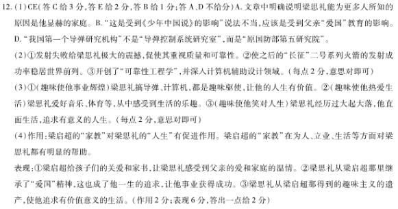家国情怀 李艳 梁思礼的名字为更多人所知是因他显赫的家庭——他的父亲是近代中国有名的大家梁启超,他的兄长是中国著名的建筑学家梁思成。然而对了解航天的人们来说,梁思礼的大名同样是“如雷贯耳”。他是中国著名的导弹和火箭控制系统专家,他参与了中国航天历史上的诸多“首次”。曾在“长征二号”运载火箭研制中首次采用新技术。 1924年,51岁的梁启超迎来了他最小的儿子梁思礼。在后来的许多年里,梁思礼每每回忆他与父亲的相处,总是充满了怀念和温情。“有人曾经问我,你从你父亲那里继承下了最宝贵的东西是什么?我回答说“爱国”,梁思礼说,“父亲生前曾说过,‘人必真有爱国心,然后方可以用大事’,这句话支撑了我一生的追求。” 梁思礼1949年从美国回国。在最艰难的岁月他仍一心为国,投身航天。“从第一颗原子弹、第一枚导弹、第一颗人造地球卫星到第一艘神舟飞船,我回国后和第一代航天战士一起,白手起家、自力更生,创建起完整坚实的中国航天事业,使中国居世界航天强国之列。能为此奉献一生,我感到无比的自豪和光荣。”梁思礼曾说。梁启超曾著《少年中国说》,激励无数中华儿女奋进,梁思礼却是用了一生始终践行。 1956年是梁思礼生命中最重要的一年。这一年他入了党、走进婚姻殿堂,更重要的是,这一年中国第一个导弹研究机构——原国防部第五研究院成立。梁思礼被任命为导弹控制系统研究室副主任,是钱学森院长手下的十个室主任之一。从此,他将全部身心都融入了我国导弹与火箭的发展事业之中。“当时既无资料,也无仪器和导弹实物,除了钱学森外,谁都没有见过导弹和火箭,简直是两手空空,一张白纸。但这是一颗生机勃勃的种子。” 如果说1956年是梁思礼人生的转折点,那么“东风二号”则是他事业的关键节点。1962年,“东风二号”点火发射,起飞几秒钟后,“导弹像喝醉了酒似的摇摇晃晃,头部还冒出白烟,最后落在了发射阵地前300米的地方”,这次失败带给梁思礼极大的震撼。也是这次失败,成就了之后的长征二号系列火箭工作,更成就了梁思礼开创的“可靠性工程学”。在那之后,“我们才真正懂得怎样自行设计”。他提出: “产品质量和可靠性是设计出来的,不是统计出来的;是生产出来的,不是检验出来的;是管理出来的,不是试验出来的”。梁思礼一生得过无数奖项,有过很多头衔,但是他最珍视的便是火箭设计师。 此后梁思礼积极推行并领导实施了一系列质量控制和可靠性保证措施,使“长征二号”的可靠性大大提高,我国的发射成功率稳居世界前列,在国际上赢得了很高的声誉。1980年代后,梁思礼开始深入计算机辅助设计领域,又将可靠性的工作由硬件拓展到软件。 梁启超曾著有《学问之趣味》,文中说:“凡人必常常生活于趣味之中,生活才有价值。”这种趣味主义被梁思礼视为父亲留给他的遗产。他说,人的一生要有“趣味”,没有趣味人生就没有意义。我先搞导弹控制、再扩展到计算机应用,都是趣味驱使。 梁思礼90岁时,央视曾录制一期他的访谈,他的书房里摆满了各种唱片,俨然音乐发烧友的架式。他留学期间曾是摔跤健将,在比赛中屡有佳绩。他还喜欢游泳,且脚不着地,借着失重的状态想象着自己正在“太空出舱行走”。直到生命的最后几年,他仍未减少对体育的喜爱,2010年南非世界杯,他还像年轻人一样凌晨起来看比赛直播。在微博大热的年代,他也和年轻人一同关注,并感慨它“现在有些‘乱’,但可以汲取的营养更多”。 梁思礼经历过常人难以体会的跌宕——出身名门、投身航天、功勋卓著,可谓风光无限,也曾经历幼年丧父、亲人相继离世以及特殊年代的政治风波。但这趣味二字却让他拥有了别样的人生。 (有删改) 相关链接 ① 1949年,拿到自动控制专业博士学位,著名无线电公司RAC伸出了橄榄枝,但我选择了回国,我的好朋友林桦留在了美国。他搞的是美国洲际导弹,我搞的是中国洲际导弹,我的工资只有他的百分之一。他住在西稚图一个小岛上的高级别墅里,我住在很普通的单元房子里。有人曾问我对此有何想法,我的回答是,他干的导弹是瞄准中国的,我干的导弹是保卫我们祖国的。(《一个火箭设计师的故事——梁思礼院士自述》) ②梁启超一生写给子女的家书超过百万字,字字都是满满的爱,对子女们都给予了细致的指导。他既是孩子们的慈父,又是导师、亲密的朋友。梁思礼说:“其实,在我的记忆中,我只是觉得父亲很疼爱我,当时我年纪很小,认识的字不多,很多事情也是后来看到父亲书信集的时候了解到的。”(高深《从梁思礼成长看梁启超的家教》) (1)下列对材料有关内容的分析和概括,最恰当的两项是(5分) A.梁思礼虽然有着显赫的家庭——他的父亲和兄长都是中国有名的大家,但他能为更多人所知的原因是他作为中国著名的导弹和火箭控制系统专家的身份。 B.1949年回国后,梁思礼在最艰难的岁月将全部身心都融人我国导弹与火箭的发展事业中,用一生来践行自己的追求,这是受到《少年中国说》的影响。 C.梁思礼在奖项和头衔中最珍视火箭设计师的称号,他参与了我闰原子弹、导弹、人造地球卫星、神舟飞船等诸多“首次”,也是我国第一代航天人。 D.1956年,梁思礼人党、结婚并成为我国第一个导弹研究机构——导弹控制系统研究室的副主任。这是他生命中最重