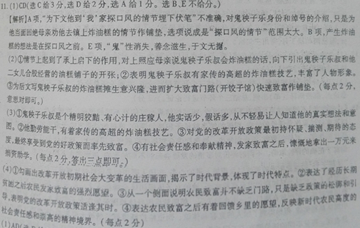 鬼秧子乐(节选) 陈忠实 鬼秧子是我一个远门堂叔的绰号,他注入户籍卡的名字,是一个单字:乐。村里人提起他来,总是忘不了在 他名字前冠以“鬼秧子”的绰号,就唤作“鬼秧子乐”了。不过,在“鬼秧子”这个“鬼”字里,主要含蕴着“诡”的意味,大致概括了我的堂叔处事和为人的一贯特点:不那么豁达爽直,也不像一般庄稼人那么憨厚实诚;举凡大事小事,家事和外事,与人交手,总显出一副诡的样子;实话少,空话多,绝不会显山露水。有人概括说,鬼秧子 乐要是说他去西京,实际准是去了东京,你要是按他说的到西京去找他,准会扑空上当了。 星期六回到家中,已是上灯时分,一进门便看见鬼秧子乐叔坐在堂屋的桌旁,正和母亲扯着闲话。他平时极少到我家来串门,于是就想到他是有意在等候我,大约要说什么话,或者要办什么事。因为他和母亲的闲聊, 完全是一种心不在焉的神气,明显是在消磨时光。 “听人说,县城的街道里,有小贩儿摆摊儿了,油糕桌子、凉粉案子都摆出来了。”鬼秧子乐叔说,完全是一种 与己无关的闲谈的口气,“政府也不干涉?” “不。”我说,“政策允许了。” “政策怎能允许私人开铺面,做生意?,,鬼秧子乐叔不解地说。 “正好相反。”我自作聪明地解释说。 他的一双眼晴勾得很低,并不看我,只是盯着自己手里那只油腻的黑色羊皮烟包,悠悠地挖着。凭直觉,我觉察出他料注地听着我的每—句话,每—个字,却摆出并不在意的架式,甚至连盯也不盯我一眼。 “你不是有炸糕的手艺么?”母亲插似,“几十年没派着用场,现时用得上了。”母亲说着,又问我你记得不?你乐叔跟你二爷(乐叔的父亲)在五里镇摆油糕桌子那阵儿,红火得很哩!你乐叔炸出的油糕,黄亮、酥脆,咬在嘴里一包糖,而今吃不上那样好的油糕了。” 我隐约有-点记忆。五里镇街心的水渠边,那位已经去世的二爷在满面笑容的招呼顾客,而正当年轻的乐叔站在翻滚着油浪的蚱锅前,两只手灵巧地捏着面团儿,把一个个扁圆的油糕贴着锅帮溜进油锅里,立时冒起一团儿油浪。炸熟的油糕漂浮在油面上,乐叔用筷子夹出来,架在铁丝网架上……我曾经馋涎欲滴地在那油锅前踅磨过,怎能完全忘记呢! “你而今要是在五里镇摆开炸锅,保准红火。”母亲说,“老人们还都记得的。” “不!咱可不能再干那号营生了!”鬼秧子乐叔慨然说绝,“投机倒把那营生,咱绝对不能干。” “那不能说成是投机倒把……”我说。 “纵然不叫投机倒把,也不是正经路嘛!”鬼秧子乐大叔摆出一副慨然的面孔,“合法咱也不干。”咱可不能再干,他像给我做保证一样,懒洋洋地拖长声调走出门去了。 鬼秧子乐叔和他二女儿合股经营的油糕铺子正式开张营业了。我因事到五里镇文化站去,远远地看见他腰缠白布围裙,在油锅跟前忙活着,手里捏着面团,不时抓起筷子翻捣锅里的油糕。他的二女儿忙着收钱,付油糕,忙得目不暇接。鬼秧子乐叔的油糕生意特别兴隆,油锅里炸熟的油糕,供不上那些捏着票子的手的索要,人就围堵在桌前锅旁了。相形之下,另外两家油糕摊子的生意,就显得冷清了。没有办法,老人们对鬼秧子乐叔的家传的油糕手艺记忆深刻,年轻人的舌头也是十分灵敏的,专拣好吃的买。我驻足看了看,就到文化站去了。 县政府在元旦那天召开了表彰大会,十五个首先达到万元家当的农民,在肩上披挂了红绸带,胸前戴上了斗大的红纸花,打扮得新郎似的,乘十多辆彩车,在县城游了一圈。鬼秧子乐叔也被通知来开会,我和他在会场匆匆一见,他的脸上有了光彩。 今年春天,我从南方归来,看见鬼秧子乐叔和他的二女儿家的那片铺店地址上,已经竖起两层六间的楼房,外观十分漂亮,楼媚上书写着一排潇洒飘逸的行书字:“一字歌饺子馆。” 鬼秧子乐叔在门口看见我,连拽带拉,就把我拉上楼去了。下层三间,两间作饭厅,一间为作坊,二楼上开了一间雅座。坐下后,鬼秧子乐叔弄来几碟小菜,定要和我喝几盅。他告诉我,前几天,五里镇公社动员大家给学校捐款,多少不拒。鬼秧子乐叔当场站起,报了一万元,全场立时响起掌声。公社书记带头站起来,当着千余 人的面,代表五里镇几千名小学生向鬼秧子乐叔鞠躬致礼,感动得老汉热泪扑洒。 (1)下列对小说相关内容和艺术特色的分析鉴赏,最恰当的两项是(5分) A.小说开头对鬼秧子乐身份和绰号的介绍,概括了他为人处事的一贯特点,为下文他到“我”家探口风的情节埋下伏笔。 B.鬼秧子乐探了口风,明晓了国家政策之后,就产生了去镇上开店炸油糕的想法,欲搭改革开放的快车发家致富。 C.小说反映了 20世纪八十年代初期,社会经济发展政策发生重大调整的过程中生活变革的现实矛盾。人物形象朴实,性格鲜明。 D.当“我”母亲劝鬼秧子乐发挥自己的炸油糕的特长,到镇上炸油糕的时候,他两次“慨然”回绝,暗示了他必将去炸油糕的坚定行为。 E鬼秧子乐嫌捺不住致富欲念终于成为万元户后,率先为镇小学捐款1万元,表现了他的“鬼”性消失,,善念滋生,人物形象更丰富饱满。 (2)小说中间插入“我”回忆去世的二爷和乐叔炸油糕的场景有什么作用?请结合全文情节简要分析。(6分) (3)结合全文概括鬼秧子乐叔的形象特点。(6分) (4)从内容和主旨看,作者创作本文的意图有哪些?(8分) 参考答案 ![]()