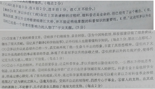 茅以升:心系科普,奋斗不已 大家都知道茅以升晚年的时候,全部精力都在做科普。却很少有人知道,其实他早在美国求学时代,心里就埋下了科普的种子,以至后来毕生都在做着对青少年的这种教育。 1920年代,他在美国读书的时候,看到一些科普书籍。有一种图书叫作《科学的故事》,讲的很多知识都不是他所学专业的知识,但是他看完以后,觉得自己也能感兴趣很读懂,他觉得特别好,就把这本书买回来。后来茅以升就拿出《科学的故事》让其子翻译,用深入浅出的语言,把科学道理给说出来,让那些外行的人也能看懂 《科学的故事》后来陆续发表在上海《科学画报》上,当时销量非常好。可以说他搞科普从那个时候就已经开始 了,也贯穿了他的一生。 1937年,建钱塘江大桥的时候,茅以升在《工程》杂志上一期一期地连续刊登建桥过程,也是科普性质的, 钱塘江大桥的工程理论都变成了科普语言发表出来。这个阶段他的专业是教书和做工程,做科普绝对是业余 的,但他有这种概念了。之后他就一发不可收,写的文章也越来越多。在他晚年退休之后,科普成为他的主北。 茅以升一生毫无怨言,不管是在什么时候。他总是在用自己的行动教育我们。他在“文化大革命,’时受到 了一些冲击,全家人被赶到一个很小的房子里头。妻子给他做了一个很小的书屋,也就三四平方米吧,他一起 床就伏案,几乎不离他的小书屋。《桥话》就是那时候写的。家人每天一睁眼就能看到他,他就是那种奋斗不息 的状态。 《桥话》写完了,希望有出版社能出版,但是大家已经开始看经济效益。大家一看都说真了不起,佩服得五 体投地,因为他都是用蝇头小楷写的,50多万字,从第一个字到最后一个字都写得那么漂亮,你看他写字这个精 神就能够感动你。但是整个看完以后,他们觉得没有经济效益,所以一直就没有出。这部书稿在书柜里躺了三 十年,直到19%年西南交大成立一百周年,也是茅以升一百岁时,才由西南交大出版社出版。 茅以升给子女看到的,就是不断在学习,不断在奋斗。他有一句话:“人生一征途耳,其长百年,我已走过十之七八,回首前尘,历历在目,崎岖多于平坦,忽深谷,忽洪涛,幸赖桥梁以渡,桥何名欤?曰奋斗。”这句话虽然有点文言,正是他一生的写照,他一辈子就是在奋斗。他那么老了,八九十岁了,家里也有比较好的条件了,完全可以颐养天年,但是他没有,而是一直为科普事业奋斗,为孩子们做报告,给孩子们回信。茅以升年老的时候,眼睛很不好,1500度的近视,黄斑病变种没法治,但是他所有的回信,包括学生来的信,少年儿童来的信,都是他自己回。茅以升的秘书很多,做他的秘书很舒服,不用做发言稿什么的,他全部都自己写。但是他写,他会写坏,眼睛不好嘛,会写作一团,女儿就给他想了个办法,拿一张A4纸那么大的硬纸板,给他刻成一条一条的 槽,后面搁一张白纸,再放一张化学板作垫板,拿夹子一夹。他就这么一行一行摸着写,有可能两个字写在一 起,但不会上下串行,这样他都写了很多东西,包括对中国科技馆 我们国家第一座科技馆的建设有很多的提议,全都是他一个字一个字写出来。 茅以升工作 一辈子,除了吃饭睡觉,他就坐在他那张桌子旁,像个雕像一样,但是他的大脑不停地在思考,在创造。 相关链接: ①茅以升(1896—1989),土木工程学家、桥梁专家、工程教育家,中国科学院院士,美国工程院院士,中国研究院院士茅以升主持中国铁道科学研究院工作30余年,为铁道科学技术进步作出了卓越的贡献。积极倡导 土力学学科工程中应用开拓者。茅以升曾主持建了中国人自己设计并建造的第一座现代化大型桥梁一 钱塘江大桥,这座大桥成为中国铁路桥梁史上的一块里程碑;新中国成立后,他又参与设计了武汉长江大挢。晚年他编写了《中国桥梁史》《中国的古桥和新桥》等。一生发表200多篇论著,其中科普论著文章约占1/3。 ②著名科学家周培源《桥梁专家茅以升》一书中指出:“茅以升对我国科技事业的贡献是多方面的。”他为中国科学普及事业如科技馆、科技报建设等方面作出的重大贡献,并不为多人所熟知。 (1)下列对材料有关内容的分析和概括,最恰当的两项是(5分) A.在美国读书的时候,《科学的故事》中虽然有好多知识都不是他所学专业的知识,但他引起了茅以升的兴趣,这给他心里埋下了科普的种子。 B.1937年1937年,的时候,茅以升开始在《工程》杂志上一期一期地连续刊登建建钱塘江大桥的过程,把工程理论变成了科普语言,标志着他已经有了非常专业的科普知识。发表出来。 C. 茅以升曾主持建了中国人自己设计并建造的第一座现代化大型桥梁一 钱塘江大桥,这座大桥成为中国铁路桥梁史上的一块里程碑,足以说明其掌握的科普知识的重要性。 D. 茅以升眼睛不好,也有很多秘书,但是茅以升坚持自己给孩子们回信,可以看出他对科普知识的重视和对孩子们的关心。 E.茅以升接触并让其子翻译的《科学的故事》陆续发表在上海《科学画报》上,当时销量非常好,这说明茅以升在当时已经是一个非常有影响力的人物了。 (2)茅以升一生心系科普,从文中看,他在科普方面做了哪些贡献?请结合材料简要概括。(6分) (3)简要分析文中画线句子的作用。(6分) (4)作为一个在科技事业上取得巨大成就的人,茅以升的成功有许多原因。结合材料具体分析。(8分) 参考答案