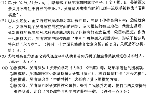 吴清源:换一个世界下棋 2014年11月30日凌晨1时许,围棋界泰斗吴清源在日本神奈川一家医院去世,享年100岁。吴清源他曾经称霸日本棋坛数十年,在全盛期通过十番棋击败同时代的所有其他日本棋手,被誉为“昭和棋圣”。 “手指修长,脖颈白皙,使人感到他具有贵族的睿智和哀愁,如今又加上少僧般的高贵品格。从耳朵到脸型,都是一副高贵相。过去从未有人给我留下这样的天才的鲜明印象。”诺贝尔文学奖得主、吴清源的好友川端康成并没有说错,吴清源就出自一个没落的官宦之家。 父亲吴毅早年在日本留学,并没有专注于自己选修的专业,而是在那里爱上了围棋,并带回了大量的围棋书籍。早年,吴清源即以“围棋神童”身份出入段祺瑞府邸,每个月能够得到段祺瑞的100银元津贴。11岁就因父亲病故开始以围棋担起一家生活的吴清源,对于围棋的热爱也从那时开始与日俱增。1926年,在北京通过岩本薰六段和小杉丁四段的棋力测试后,他东渡日本,拜师濑越宪作七段,开始了棋手生涯。 1933年,年仅19岁的吴清源运用自创的“新布局”,与本因坊秀哉名人等对弈,开创了围棋史上的一个新时代。此后二十几年,吴氏横扫千军,超越前贤,雄踞“天下第一”的无冕王位:尤其是那些被誉为“悬崖上的白刃格斗”的“升降十番棋”,更是充分展示其过人的意志与才华。“吴清源时代”, “昭和棋圣”的地位由此奠定。 幼年时的记忆技巧以及对于中国传统文化的烂熟于心也在日后帮助吴清源开创自己的棋风。当他7岁开始学棋时,对于打谱学棋已自觉不累。而“礼之用,和为贵”“致中和”“过犹不及”“君子矜而不争”等中国传统文化基因也一直影响着他的围棋观。 吴清源自己也曾说过从4岁开始,就学习《大学》《中庸》等,而直至晚年仍然坚持每天研究《易经》,汲取理念打造“六合之棋”这个“21世纪的围棋”。 对于名利,吴清源没有任何欲念,他的世界就存在于纹枰之上的方寸之间。即便谈及“棋圣”的殊荣,吴清源的回应也简单至极,“我个人不认为自己是棋圣。人来到的世间就有自己的任务,即便活在世间,就要为自己的任务去努力”。 如果说对于一心追求棋力的棋士来说,抛弃名利尚且可以理解,那么对于胜负的寡淡或许才是普通棋手和一代大师之间不甚明晰的鸿沟。 “与吴清源一起生活这么多年,她也觉得,先生在人神之间。”吴清源去参加十番棋,俨然仅仅是出一趟门一样轻描淡写。晚辈江铸久曾与吴清源夫人和子交谈过:“有时候夫人甚至只能从先生的精神状态才能判断输赢,神情轻松那么说明赢了,如果略显疲劳则是输棋了。” 对于胜负的概念早已超然,江铸久也曾与吴清源探讨过每一个棋手都在内心追寻的问题答案,而吴清源的回答简单又颇具韵味,“胜与负,不是我下得好还是不好,而是我还能不能下得更好”。 吴清源一直说,“信仰与围棋犹如车之两轮,缺一不可”。 “我的感觉是,事实上是什么宗教对他来说是不太重要的,但信仰本身对他很重要。”弟子芮乃伟对于恩师的做法有着自己的理解。 “印象尤为深刻的是吴清源关于人类精神力量的谈话。他谈到佛教与神道各派的异同,令我十分惊异。而且他对心灵学也颇有研究。也就是说,这是修养之道,是为了使自己的灵智澄静明澈。”川端康成也曾如此解读吴清源执着于信仰的原因。 他也曾解读过自己追寻的“中的精神”,“‘中’这个字,中间的一竖将口字分成左右两部分,这左右两部分分别代表着阴和阳。而阴阳平衡的那一点正好是‘中’。在围棋上,我经常说,要思考‘中’的那一点,中和了棋盘上各个子的作用的那一点。” 对他来说,棋是“武”的胜负世界,宗教是“文”的和平世界。文武双修,在内心同时涵蓄战争与和平这两个截然相反的境界,并且取得两者的平衡,正好显示吴清源始终还是一个深受传统文化影响的中国人。 相关联接: ①吴清源晚年将毕生精力放在了提携后进、促进围棋国际化和中国围棋的发展上,他更以毕生之体悟,融汇古老的中华文化,提出21世纪的围棋——六合之棋。 ②吴清源先生把“21世纪的围棋”称作“六合之棋”。所谓“六合”,在古文里是宇宙的意思,表示东西南北的四方和上下的天地。也就是说,围棋的目标不是局限于边角,而是应该很好地保持全体的平衡,每一手必须是考虑全盘整体的平衡去下。这就是“六合之棋”。 (1)下列对材料有关内容的分析和概括,最恰当的两项是(5分) A.川端康成了解吴清源的家世及其生平,他写到吴清源“手指修长,脖颈白皙,使人感到他具有贵族的睿智和哀愁”。 B.吴清源的父亲吴毅留学日本,放弃了自己本来的专业,在那里爱上了围棋,并带回了大量的围棋书籍,这些极大地影响了吴清源。 C.吴清源东渡日本后,开始了专业棋手生涯。他自创“新布局”,鏖战“升降十番棋”,在围棋界引起巨大反响。 D.文章引用了吴清源的后辈门生的话,体现了晚辈对吴清源的尊重,同时也表现了吴清源独特的人格魅力。 E.吴清源因为在“昭和”时代创造了包涵天地自然意蕴的“六合棋”,因而被称为“昭和棋圣”。 (2)本文主要是从哪些方面介绍围棋大师吴清源的?请简要分析。(6分) (3)请简要概括围棋大师吴清源的形象特征。(6分) (4)请结合材料,简要分析东方传统文化对吴清源的影响。(8分) 参考答案 ![]()