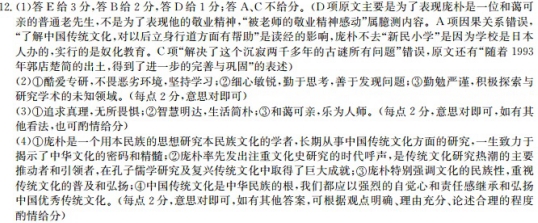 庞朴:解读中华文化的密码 法帅 1939年,日本人打到庞朴的家乡,办了“新民小学”,实行奴化教育,要他们去读书。庞朴不去,他到爷爷朋友办的私塾读经。庞朴说,小时候读经,“对于进一步了解中国文化,对于长大后待人接物、为人处世、立身行道,有很大的好处。”1952年,庞朴到中国人民大学学习哲学。两年后,庞朴毕业回到山东大学教马克思主义哲学,后转到中国哲学的研究领域。熟知庞朴的人都知道,他是一个能够为了真理而无所畏惧的人。1949年,年仅20出头的庞朴,就做了一件置生死于度外的事情:从蒋管区投奔到解放区。到了解放区,庞朴就留在了华东大学。对于这段时间的工作和生活,庞朴说道:“从蒋管区到解放区,虽然只是换了个地方,但却像换了一种空气,换了一个时代。” 1971年,庞朴被下放到了曲阜,庞朴的书都被贴上了封条,这时庞朴干什么呢?“地上没有书可念,我就念这个天书。”于是,夏天的晚上,庞朴就搬把椅子,在操场上看星空。花了两年的时间,把漫天的星空都搞清楚了。没想到,庞朴看星星,却直接引出了一个重要的学术发现——火历。到了“文革”后期,庞朴可以读书了。有一天,他在研读《左传》时,发现昭公17年有过一段将正月朔与四月朔搞混的讨论,他追问道,这提出了一个有关中国古代历法的大问题:正月,何以也在周六月或夏四月?以前从没有人认真对待过这个问题。经过思考,庞补发现,这是有两套历法的缘故。于是,庞朴顺着这个线索开始梳理,结果发现在中国上古曾有一个关于火历的问题,获得天文史学界的高度评价。 20世纪80年代“文化热”的出现,与庞朴对文化研究的重视和推动有莫大关系。1981年,庞朴受联合国教科文组织之聘,担任《人类文化与科学发展史》国际编委会中国代表,他开始在学界呼吁文化研究的重要性。面对全盘西化的社会思潮,庞朴率先发出重视文化史研究的时代呼声,在他看来,“文化的首要属性是民族性,其次才是时代性;中国的现代化绝不是西方化,也绝不能西方化”。在整个20世纪80年代,庞朴曾就文化学、文化史、文化传统与现代化诸问题,数十次发表演说、撰写文章,阐述其对文化的各种思想认识,从而推动了文化研究热潮的前进。 庞朴知识渊博,见解深刻,富有创新精神。而在诸多创见中,影响最大的莫过于对中华文化密码“一分为三”的探究,这揭示了中华文化的密码和精髓。长沙马王堆三号汉墓出土的帛书,给我们送来了打开思孟五行之谜的第一把秘钥,而庞朴先生便是这把神奇秘钥的发现者。《马王堆帛书解开了思孟五行说古谜》一文,使沉寂了两千多年的思孟五行古谜,因之得以迎刃而解,随着1993年郭店楚简的出土,得到了进一步的完善与巩固。 进入21世纪,庞朴先生特别重视传统文化的普及和弘扬,主持《儒学小丛书100种》的撰写工作,以求学问的上学而下达,让人们从中获得安身立命的真谛。 庞朴的生活似乎很简朴,生活中的饭菜也是朴素得很,吃的都是市场上最普通的蔬菜水果、鸡鸭鱼肉什么的。老年人整天担心惧怕的“三高”问题,从来没有发生在庞朴的身上。可以说简朴的后面却不简单。庞朴在生活中是一位和蔼可亲的普通老先生。有一次,庞朴在医院打吊瓶的时候,突然对来看望的学生讲起古文,学生们围在旁边认真地听讲起来,一时成为病房里的一景。庞朴曾因身体乏力等问题住过几次医院。同医院打交道多了,庞补发现中西医在治疗方法上有着根本的不同,于是,他给医院也下了个诊断:“中医是治病的人,西医是治人的病。”用简单的一句话,将中西医的本质区别指了出来。 【相关链接】 ①为表彰庞朴先生在孔子儒学研究及复兴传统文化中取得的巨大成就,2010年9月,在山东曲阜召开的第三届世界儒学大会,授予了庞朴先生当前儒学研究领域的最高奖项“孔子文化奖”,庞先生被“孔子文化奖”推选委员会评价为:能够用本民族的思想研究本民族文化的学者。 ②山东大学儒学高等研究院常务副院长王学典说:“庞朴先生有着强烈的文化自觉,他一生对中国传统文化抱有温情和敬意。” (1)下列对材料有关内容的分析和概括,最恰当的两项是(S分) A.为了解中国传统文化,也为了能对以后立身行道方面有所帮助,所以庞朴没有去日本人办的“新民小学”上学,而是到他爷爷朋友办的私塾读经。 B.庞朴是一个杰出的学者,他不仅知识渊博,见解深刻,还富有创新精神,他对中华文化密码“一分为三”的探究就是在诸多创见中影响最大的。 C.庞朴是打开思孟五行之谜第一把秘钥的发现者,他著写的《马王堆帛书解开了思孟五行说古谜》一文解决了这个沉寂两千多年的古谜所有问题。 D.庞朴身体不适躺在病床上挂吊瓶的时候,还不忘给前来看望他的学生现场开讲古文课,学生们也被老师的敬业精神感动,都围在旁边认真听讲。 E.庞朴学术领域十分广泛,在中国哲学史、文化史、文化传统与现代化、古代天文历法以及出土文献等方面都有研究,在海内外产生了重大影响。 (2)从火历的发现过程来看,庞朴治学有什么特点?请结合材料简要分析。(6分) (3)除了治学精神外,庞朴先生身上还有哪些人格魅力?请结合材料简要概括。(6分) (4)链接②中说“庞朴先生有着强烈的文化自觉,他一生对中国传统文化抱有温情和敬意”,请结合材料及相关知识,就“文化自觉”方面淡淡你的理解与看法。(8分) 参考答案