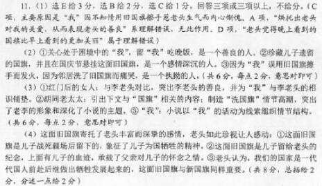 国旗 蒋一谈 我正在调研北京胡同里的日常生活,要完成五千字的毕业论文。转了几十条胡同,还没有找到大脑里早先储存好的胡同味道,忽然发现自行车骑起来越来越费劲,原来是两个轮胎都瘪了,我只能下车,推着往前走。忽然感觉有雨落下来。我加快步伐,几乎是推着车子跑了;拐了一个弯,没有修理摊,又跑过一条胡同,拐弯,还是没看见修理摊。我看见一个高高的门楼,和门楼里面气派的红色大木门。大木门是关闭着的,门上面镶满数不清的金黄色铆钉。我紧跑几步,迈上台阶,站在门楼里面。突然听到一阵犬吠,是从大门背后传来的,我打了个冷颤,似乎看见大红木门在晃动。犬吠更近了,我能想象出凶狠的狗嘴和狗牙。 “干什么的?”一个女人在门背后喊道。 “我……避避雨。” “别靠上门啊!”女人的声音充满厌恶。犬吠声更大了。 女人和狗走了,我长长地喘口气。 雨稍稍变小了,我推起自行车王胡同口跑,运动鞋和裤腿全湿了。我隐隐约约听见一个老头的声音:“小伙子……避避雨吧……到这儿避避雨吧……” 我停住脚,回过头,看见一把黄褐色的油布大伞,大伞旁边有一辆湿淋淋的三轮车,伞下坐着一个抽烟的老头,老头脚边摆着工具箱和一张湿了一半的纸牌子,纸牌子上“修车补胎”的字迹有点花了。 我点点头,把车靠在树上,跑进大伞下面,蹲下。“大爷,谢谢您!” 雨滴落在伞面上的声音特别好听。 老头挪去工具箱上的物品,用手掌擦了擦,说:“小伙子,坐上面吧。” “大爷,雨停了您帮我修修车,车胎瘪了。” “好说。”老头平静地说。 我起身坐在工具箱上,头发触到了伞的支架,耳朵离雨的声音更近了,愉快温暖的情绪逐渐包围了我。 雨停了。我把自行车推过来。老头三下五除二就修利落了,倒是我手上沾了不少油腻,就这从屋檐上留下来的雨水洗了洗手,无意中看见一条暗红色的布条耷拉在工具箱外面,就走过去,用它把湿手擦干净。“住手!住手!”老头大声喊道,跑过来,使劲抖落着布条,瞪着我。“你走吧!”他扯着嗓子说,“修好了!你走吧!” 我当然很吃惊。不就是一块破布嘛! “多……多少钱?” “不要你的钱了!你走吧!” 我摇摇头,莫名其妙地望望老头,推着自行车走了。走几步回头看,老头弯着腰坐在大伞下面,用力把湿乎乎的纸牌子扔到对面墙上。 回到学校,我从同学那里借来笔墨纸砚,一口气写了十几遍“修车补胎”,感觉有了手感,才在找来的纸牌子上郑重地写下这四个大毛笔字。 下午的阳光明亮而不刺眼。没有人修车。 “大爷,送您这个牌子,我写的。” 老头抿抿嘴,有点不好意思。我把纸牌子支在工具箱上,发现红布条不见了。 这时,胡同口传来老太太的吆喝声:“明后天挂国旗啊!庆国庆啦!六十年大庆啊!” “小伙子,你站起来一下,给你看样东西。” 我从工具箱上站起来,看着老头打开箱子,从里面取出一个塑料布包,轻轻打开,露出一摞暗红色的布料,和我上午看见的布条颜色一样。 “这是什么?”我问。 “国旗,”老头说,把布料放在膝盖上,慢慢展开,“国旗……”他说话的声音低沉下去。长这么大,还真是头一次看见这种颜色的国旗:红色和暗红色混杂在一起,极度不均匀,上下左右沾满更深的色块,左角上的五角星只能看见两个了,另外三个淹没在色斑里。 “我儿子是解放军……”他脸上浮现出淡淡的笑意,“七九年参加对越自卫反击战,死在战场上了……我儿子是举着这面国旗死的……我儿子是旗手……”他轻轻抚摸着国旗上的色斑,“上面有我儿子的血……我儿子没给我丢脸……没给国家丢脸……好儿子……”他用力挤着眼睛,把眼泪挤回眼眶,手指抖动着把国旗折叠起来,“三十年喽……三十年喽……真快啊……我死了……也会把它带走……” 两个人沉默着。这一刻,我感觉到一丝惆怅。阳光斜照在胡同口,再过一会儿,下午就变成黄昏了。三个老太太说说笑笑走过来,其中一个对老头说:“老李,国旗准备好了吗?” “把‘吗’字去掉吧。”老头笑着说。我也笑了。 回到老头住的大杂院,收拾妥当,老头拿来一根竹竿和一面鲜红的红旗,说:“刚买来的国旗,跟我到门口去,我给你说挂哪儿。”我把国旗套进竹竿,把竹竿插进铁筒。 最后一抹夕阳照在国旗上面。柔和的颜色。老头若有所思地说:“早晨看国旗和晚上看国旗的感觉不一样。” 一盘花生米,一盘豆腐丝,半瓶二锅头。 老头支撑着桌子站起身,走到门外,过了一会儿,抱着那面变了色的国旗进了屋。“帮大爷个忙,竹竿没有了,就用这根铁条吧……三十年了……也纪念纪念我儿子……” 借着胡同里的微弱灯光,我看见两面国旗紧紧地贴在一起,像一对父子,又像一对孪生兄弟。我感觉到自己的眼睛有点发涩。 阳光刚刚露出脸。胡同里的国旗一溜排开,红红的旗帜和灰色的墙壁映衬在一起,别有一番味道。修车摊前空无一人,我听见了远处若隐若现的哀号声,好像是大爷的声音……老头瘫坐在地上,怀里抱着那面湿漉漉的国旗——已被修过一遍的国旗。左上角的五角星很鲜亮,旗帜的色泽由暗红变为浅红……“为啥要洗啊……为啥要洗啊……” “他的国旗太脏了,影响胡同景观!” “咱们是好心,怎么就……” “老李和这国旗有故事吧?” 我知道这个故事。 老头儿子的故事。 (1)下列对这篇小说思想内容与艺术特色的分析和鉴赏,最恰当的两项是( A.“发现自行车骑起来越来越费