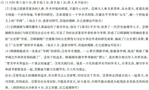 “学阀”顾颉刚 朱洪涛 1929年,顾颉刚因不满中山大学的人事、学术环境,决定北上就任燕京大学教职。他没有选择北京大学、清华大学,是怕攻讦太甚无法安心问学,燕大人事关系简单、自由度大,顾认为是治学佳地。顾颉刚给燕大提出的七项要求,很可窥见顾的择校之由:(1)不引进政客,免致机关本身受政治摇撼。(2)不引进复古派,免致学术不能照了轨道走。(3)不引进学阀,免致学术机关为其私人垄断。(4)不引进文人,免致机关腐化,致同事不勤业务。(5)不引进平庸人,免致发表刊物为讲义式之文字。(6)不引进头脑不清之人,免闹意见。(7)不引进爱发议论而不负责任之人,免致团体分裂。 此处的“学阀”在顾的脑海中完全是一负面词汇,为培植私人、党同伐异的代名词,顾相当反感这种消极意义的学阀。他的学术理想是建立一个学术共同体。顾有此体认,是他对当时北平学界有一整体观察,即认为此时在学界若无人引荐,青年学子很难打入进去。学界已经山头林立,板结固化了。因此他想打破这种局势,做积极意义的学阀。 顾颉刚想做积极意义上的学阀,这与他的学术理想与性格有莫大之关系。其实,顾心目中的学阀概念是一褒义词,不是为己,乃为公。顾以为做学问与征战一样,将帅、兵丁都是需要的,二者互相配合,才能发挥最大的功效,要能做兵丁,但更要有做将帅的野心。研究学问的人如果没有做领袖的野心,顾说这样的人绝不会有独特的成绩。但如果单单只有做领袖的野心,而不肯切切实实下苦功,那则更没出息,因为这样的人从此只会“奔走联络,抢地盘,包而不办,排挤人才,陷害青年”。顾颉刚觉得要决绝舍弃做包而不办之领袖的野心,应当刻苦地工作,使得后世的人承认你是一个“真实的领袖”,而非空有其名。 学阀,学阀,要先有学而后可阀,二者须若合符节才行。顾的这个意思在1919年批评马叙伦时已经明白表述。时为北京大学哲学门学生的顾颉刚很反感当时北大教授的马叙伦连载关于《庄子》的读书札记。顾说马叙伦做这种疏证、校勘记,自以为是一个大学者,其实“他心里也不晓得学问是什么东西”,只知有了名,受人恭敬,是很快乐的事情。顾颉刚不甘做马叙伦这种小文人、小学者。他承认,“我除了做学阀之外再没有别的路了”,他想做真学阀以打倒假学阀,“要为学术界造出一个真正的地盘,替代了现在存在的个人主义的地盘”。 顾颉刚喜欢聚合相关学人共举其成。好处是各司其责,但协调不好,便会顾此失彼。所以然者,乃在顾颉刚“好定计划,好拼命办一件事。盖弟生性贪多务博,好大喜功,无论什么事情,一经着手立刻会有野心,希望得到最高的成绩”,而且一着手就是“最大最好之计划”,结果往往是开局甚好,收尾实难,总有遗憾。从他一生的行迹看,可以毫不夸张地说,他实在是一少见的爱学乐学的学术人。日常生活,都与学术和读书紧密连在一起。从他每日所记最终达数百万字日记、十五卷读书笔记以及大量文稿看,他几乎天天在读书,简直骇人!这种勤奋与毅力实属罕见,不得不令人叹为观止。难怪香港学者许冠三评价顾颉刚是20世纪罕有的读书人。 总括来说,顾颉刚想做名实相符的学阀,以扎扎实实的工作求真实的名声,在宏大而厚实的学术事业里贡献出自己的一抔土。实际上顾也做到了,他在学术领域成功地开疆拓土,无奈他贪多贪大的性格既成全了他勃勃的学术雄心,也一定程度毁了他,许地山称顾为“学术上的多妻主义者”,虽为戏言也是实情。他也知道自己的特性,曾书一条幅“好大喜功,永为怨府;贪多务得,何有闲时”以自戒,只是性格使然,改不了了。 【相关链接】 ①1934年年初,顾颉刚与谭其骧等人筹备组织禹贡学会,创办的《禹贡》半月刊成为当时中国历史地理、边疆和民族史研究的总汇,培养了一代历史地理学人才,并创立了中国的历史地理这门学科。 顾颉刚广集当时古史辨伪大讨论中多位学者的研究成果编成《古史辨》多册。他的重要著述尚有《汉代学术史略》《秦汉的方士与儒生》《尚书通检》《中国疆域沿革史》《史林杂识》等。(摘自国学网) ②1923年5月,顾颉刚发表的《与钱玄同先生论古史书》,引起史学界众多学者持久的考辨,参与者有钱玄同、胡适、魏建功、罗根泽、童书业、王国维、傅斯年、钱穆、冯友兰等。以此为标志,形成了以顾颉刚为领袖的“古史辨”派。它已成为20世纪中国史学界、古典学界不可绕过的巨大存在。 1926年,顾颉刚的《吴歌甲集》由北大歌谣研究会出版单行本,这是一部科研价值很高的歌谣集子,不但出版的时间较早,而且有比较详尽的注释等。刘半农写信给他说:“中国民俗学的第一把交椅,给你抢去坐稳了。”(选自《中国现代学术史上的顾颉刚》) (1)下列对材料有关内容的分析和概括,最恰当的两项是(5分) A.顾颉刚离开中山大学而就职燕京大学,对用人标准提出七项要求,极为具体缜密,对所述七类人全面否定,显示了他的狂大得势。 B.顾颉刚心目中的学阀是一褒义词,不是为己,而是为公,故认为马叙伦连载对《庄子》的疏证、校勘等是小学者、小文人的做法。 C.顾颉刚从大学时代就有了要做真学阀、不做假学阀的学术追求,并且一生努力读书治学,笔耕不辍,终于有所成就。 D.顾颉刚在多个学术领域都有开创性贡献,是名实相符的学阀,他创立了中国的历史地理学科,还被称为中国民俗学