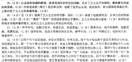 怕 周海亮 他日出而作,日落而息,养鸡,放牛,院角为女儿种满桃红色的指甲花。他喜欢躺在树荫下,枕着锄头,眯着眼,喝女人为他沏好的茶。①日子从叶隙间溜走,从禾尖上溜走,从荼香里溜走,从花开花落中溜走,他迷恋这种感觉。可是战争来了,安静的生活突然被打断,他不得不离开。 他离开,因为他怕死,怕女儿和妻子遭遇意外。他亲眼看见弹片将一个男人瞬间撕开,那个男人,不过是如他一样的农人。还有远处的枪炮声,俯冲下来的飞机,映红天边的火光,撤进村子的伤兵,蠕动的肠子和流淌的鲜血……他必须离开,暂别祖辈留下的土炕、土屋、土狗、土地。他曾以为战争与他无关,但现在,他必须逃离。 他怕死,更怕别离。 他随着人群,逃出村子,逃上公路。飞机追赶着他们,炸弹不断在人群里爆炸,残肢断臂,随处可见。人群躲进深山,燃烧弹倾泻下来,人被烧成炭,炭继续燃烧,世界变成地狱,地狱灼热滚烫。他不明白农人有什么错,他只知道他们无处可藏。又有士兵追赶上来,大山被层层围困,等待他们的,只剩死去和被俘。很多人期待被俘,被俘还有机会,还有解释或者求饶的机会,但是他不想。他什么也没有做错,他不想解释或者求饶。 他逃了出去。几百农人,他是唯一逃出去的一个。他追上撤退的部队,成为一名士兵。有老兵劝他不要当兵,老兵说,以我们的装备,这不是打仗,不是拼命,而是送死。他说,我当兵。老兵说,当兵,肯定活不过三个月;被俘运气好的话,可以熬到战争结束。他说,我当兵。老兵说,真不怕死?他说,怕死,但我当兵。 他怕死,更怕奴役。 他没有枪。没有枪的新兵很多。冲锋时,他扛着大刀,紧跟住前面的老兵。老兵倒下了,他捡起枪,继续往前。战斗打响以前,他曾担心过枪,老兵告诉他,这个最不用担心。他说今天是他当兵三个月的最后一天,正常的话,就该阵亡了。他猜得很准。他还说,现在当兵两个月,就是老兵了。他这才知道,老兵不过二十一岁,三个月以前,还是西式医院里的一名牙医学徒。 老兵说得没错,他们不是拼命,而是送死。一波儿人填进去,一波儿人又填进去,一波儿人再填进去,似乎死的不是人,而是牲畜。长官说,这叫“添油”,这是他们唯一可以选择的战术。他懂。在乡下,冬夜长,想油灯燃烧不息,就得不停地添油。他想,之所以让士兵们前赴后继,是因为,那火焰可以奄奄一息,但绝不能灭。 他怕死,更怕熄灭。 ②可是战争竟然结束了,竟然真的结束了。听到这个消息,他不相信,仍然攥着烧火棍般的枪,缩在战壕里,不敢出来。他已当兵三年,他是整个师部唯一活过三年的士兵。三年里他杀死十多名敌兵,他清晰地记得每一个士兵的模样和临死前的表情。在他随后的生命里,那些士兵毫发毕现,面目狰狞,夜夜与他纠缠。不管如何,他成为英雄,他应该受到赞美和礼遇。 可是他回到乡下,日出而作,日落而息,养鸡,放牛,院角种满桃红色的指甲花。他说我打仗,不就是为了回来吗?这么多人送死,不就是为了这样的生活吗?这样,挺好,挺知足。 很多年过去,几乎没有人再记起他曾经是一名士兵。又很多年过去,几乎没有人再知道这里曾经被轰炸、被占领、被蹂躏,这里的人们曾经被驱赶、被奴役、被屠杀。每一天,他哆哆嗦嗦地走过村路,挤满老年斑的脸努力抬起。他仰望天空,他怕有一天,天空里再次出现密密匝匝的飞机,然后,炸弹呼啸而下。临终前几天,他想告诉每一个人,曾经的村子,妻子,女儿,父亲,母亲,兄弟,炸弹,大火,老兵,战壕,履带,尘烟,炸成两段的尸体,黏稠的鲜血,鲜血,鲜血……可是他太老了,已经发不出声音。他知道他不会忘记,但他怕活着的人们,会忘记。 他不怕死,他更怕遗忘。 19.简要分析老兵这个人物在小说中的作用。 20.解释文中划线句子的含意。(4分) ①日子从叶隙间溜走,从禾尖上溜走,从茶香里溜走,从花开花落中溜走,他迷恋这种感觉。(2分) ②可是战争竟然结束了,竟然真的结束了。(2分) 21.文中的主人公“他”具有哪些优秀品质?请作简要概括。 (4分) 22.文中划 “ 参考答案